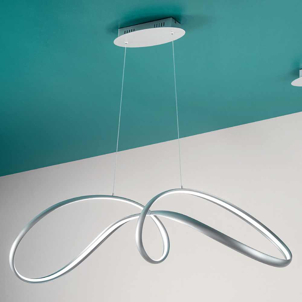 Lámpara colgante LED en metal plateado y polímero, de diseño moderno en dos dimensiones.