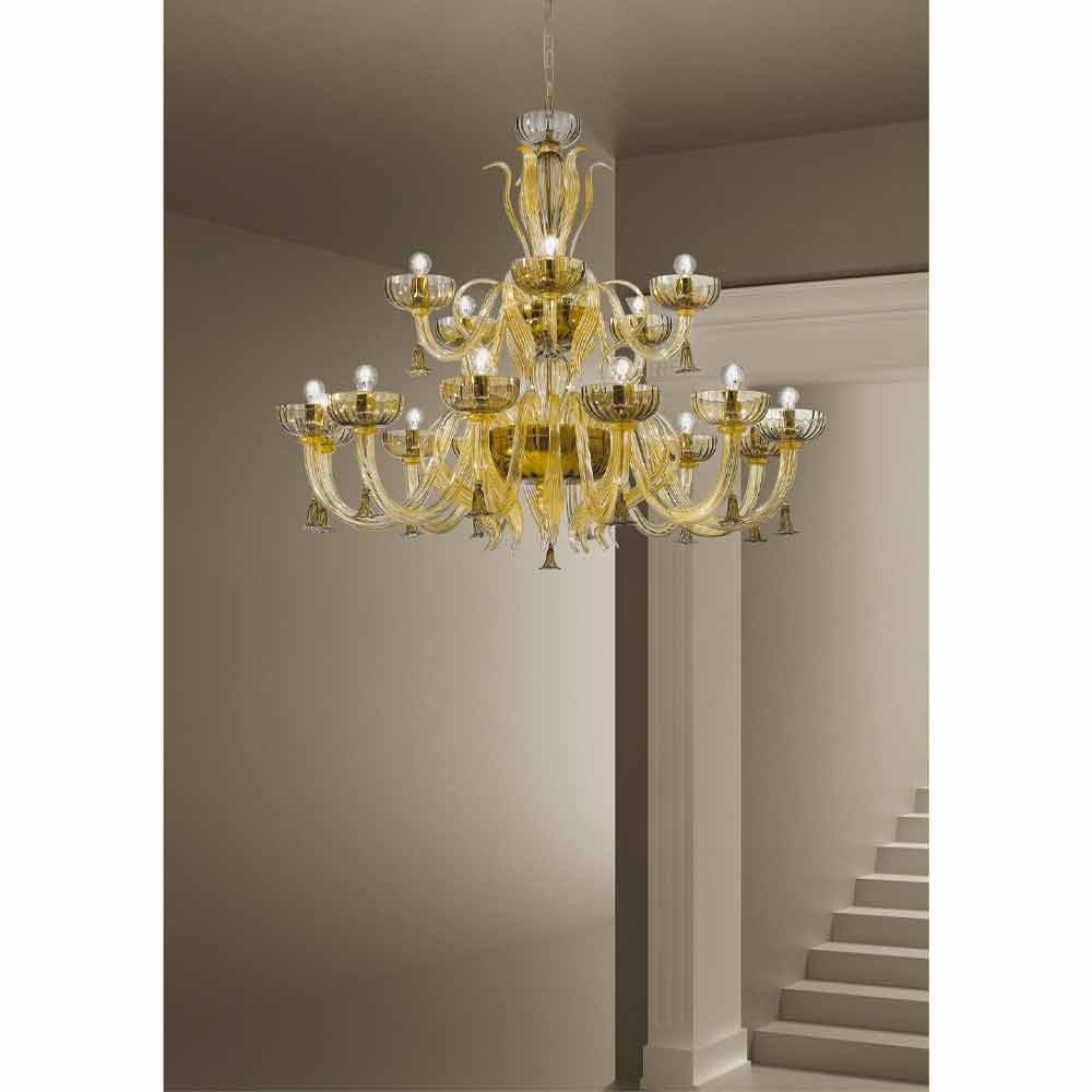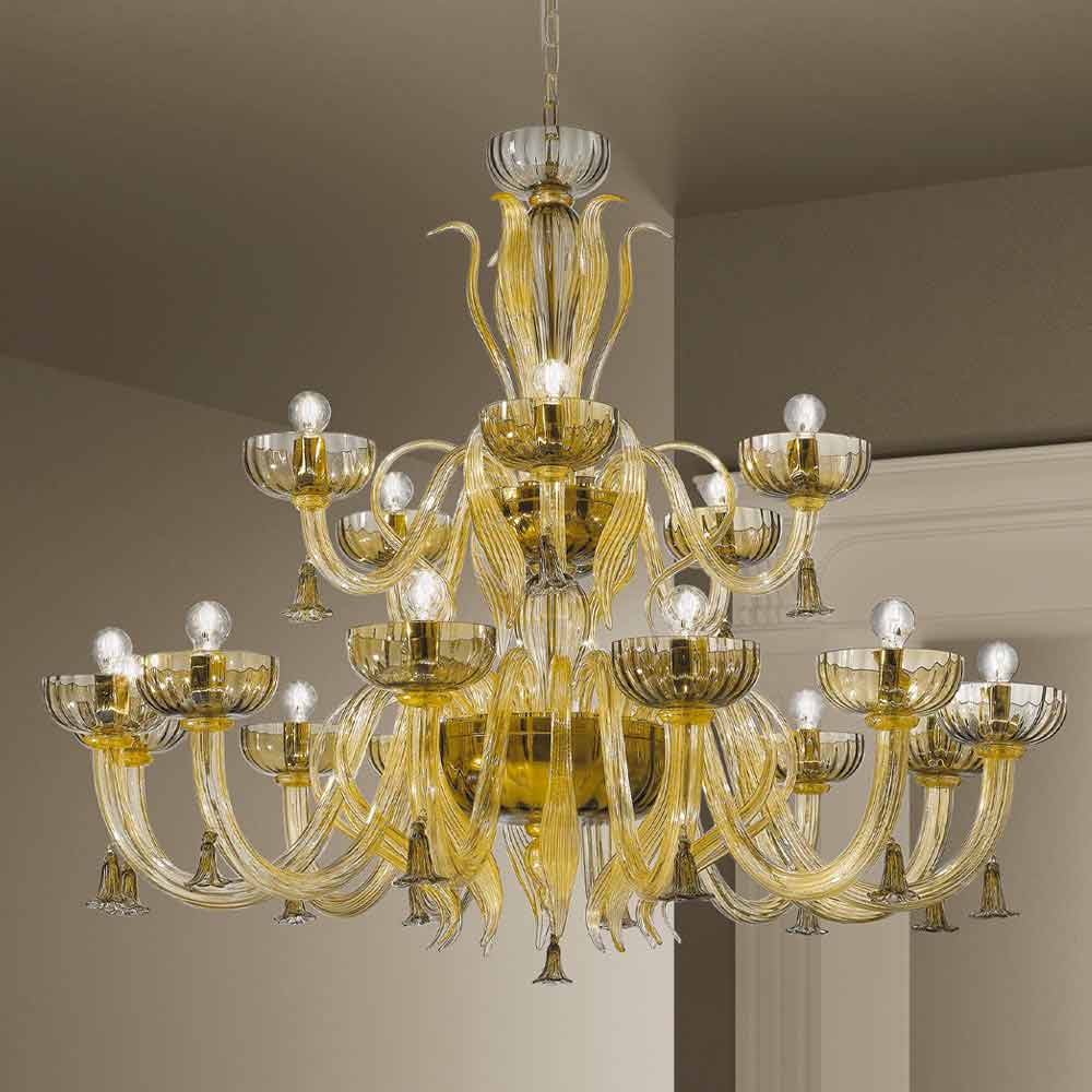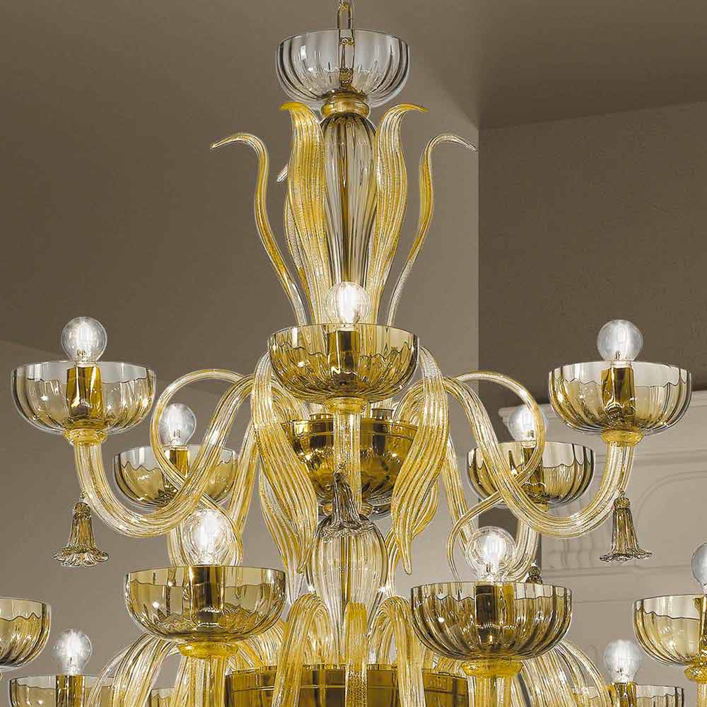 Araña de 18 luces en cristal veneciano y oro de 24k, hecha a mano en Italia.