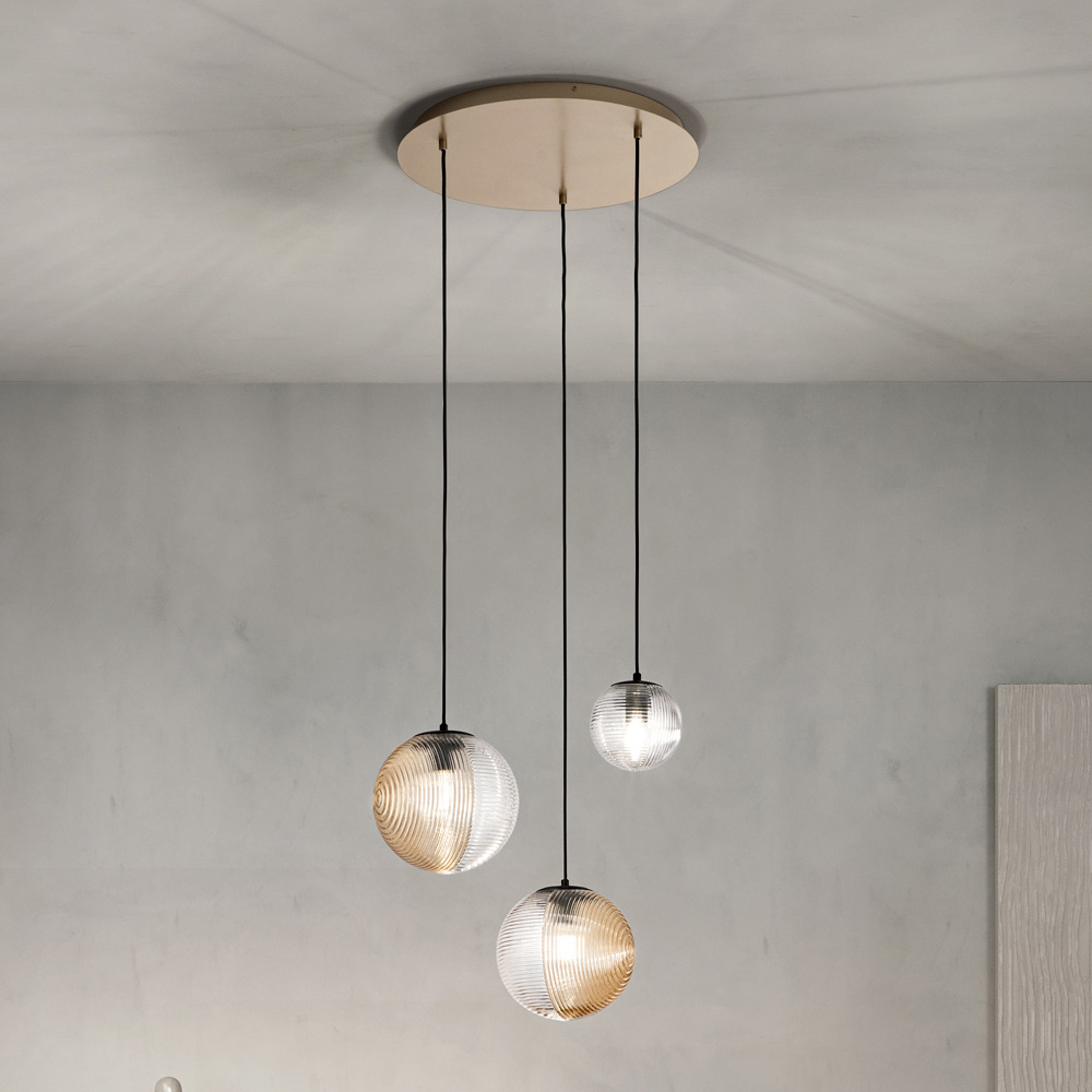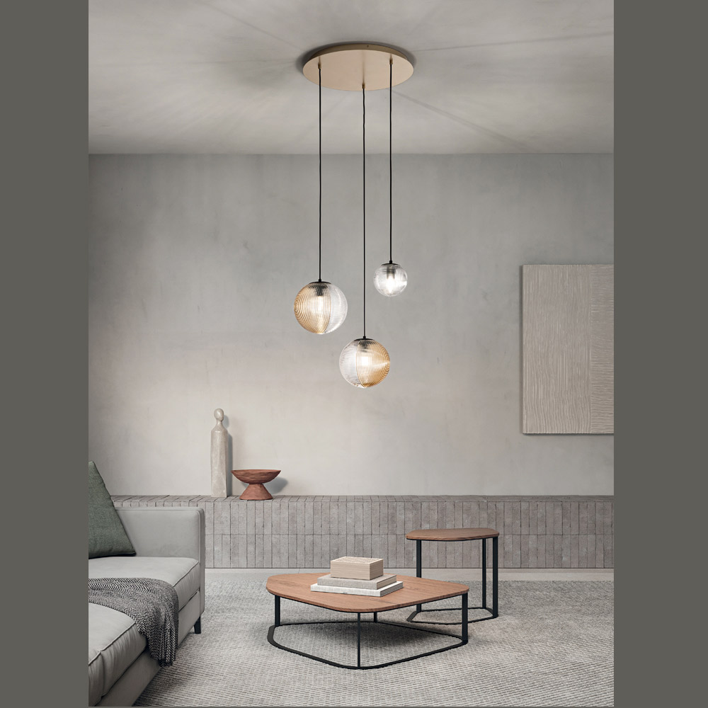Sumérgete en una atmósfera de elegancia moderna con esta lámpara colgante, perfecta para añadir un toque de lujo sobrio a cualquier espacio. Las esferas luminosas cuelgan en una danza armoniosa de luz y reflejos , cada una encapsulada en vidrio soplado con diferentes acabados, reflejando una luz cálida y acogedora .