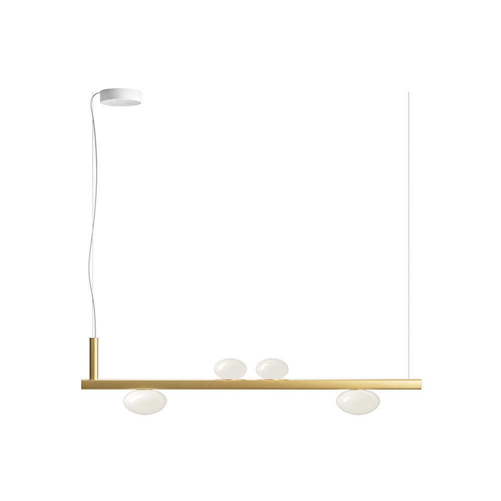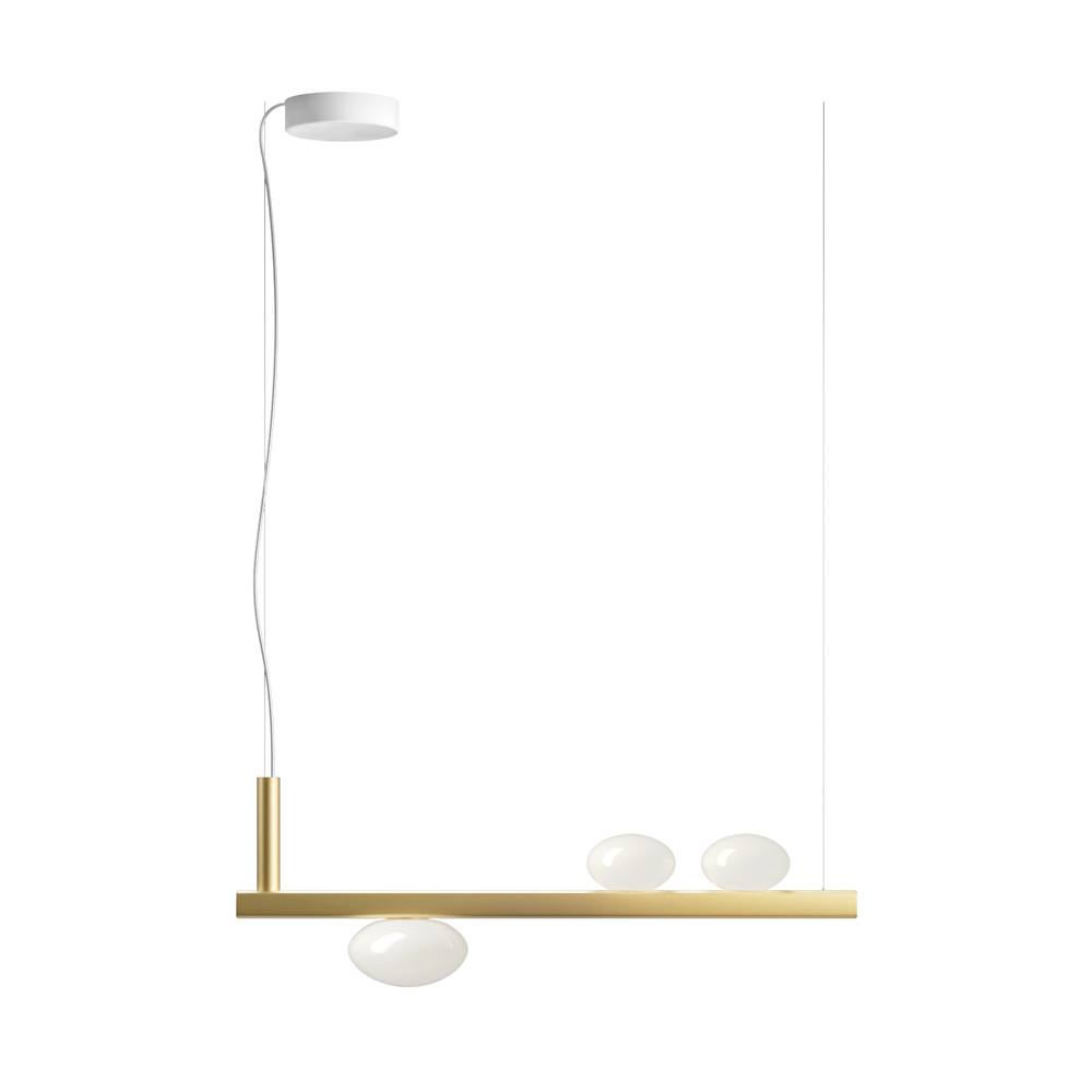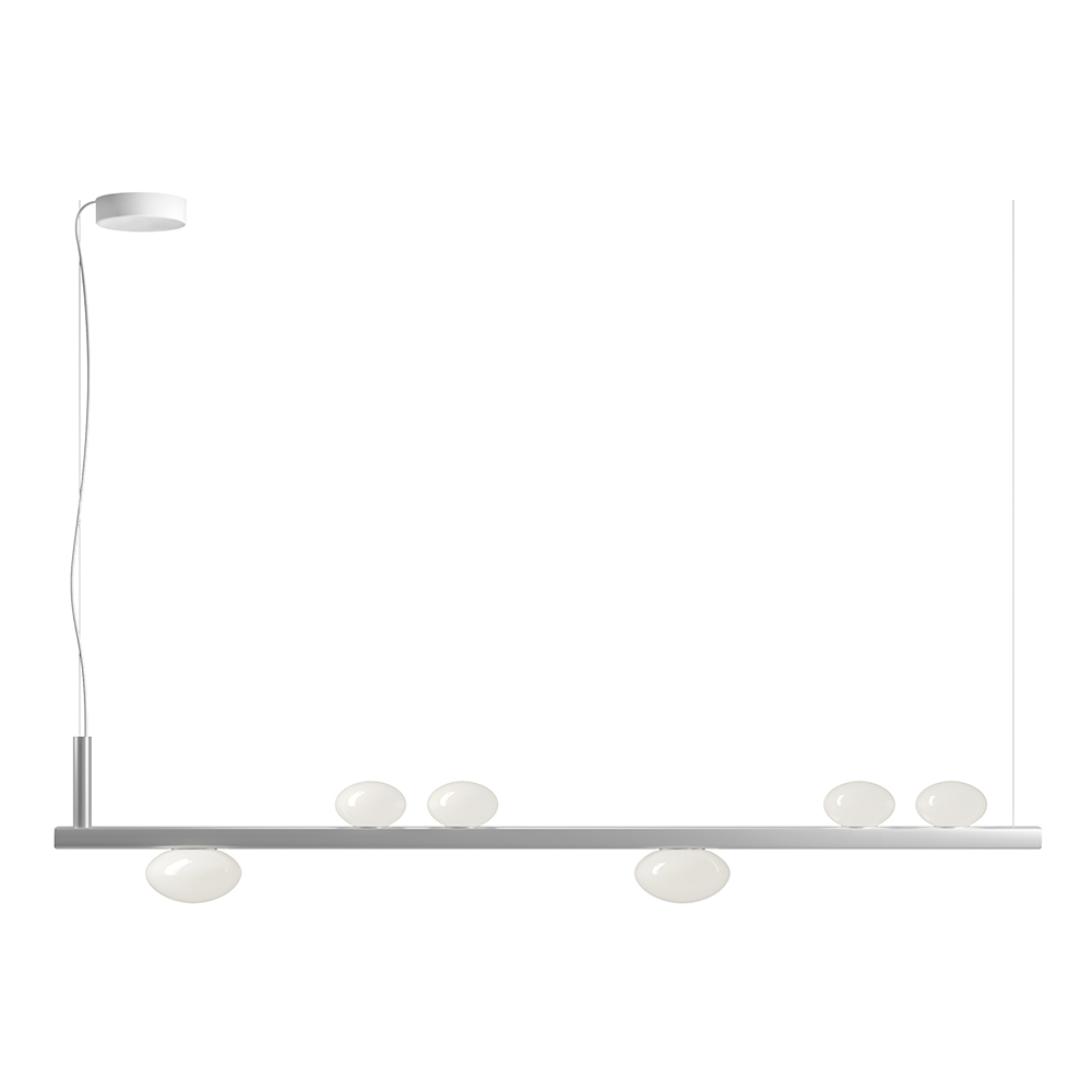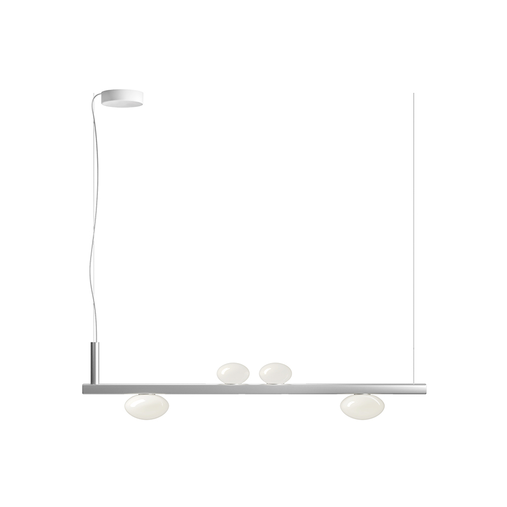Lámpara de interior realizada con estructura de aluminio reciclable y lámparas de cristal soplado en color blanco lechoso.