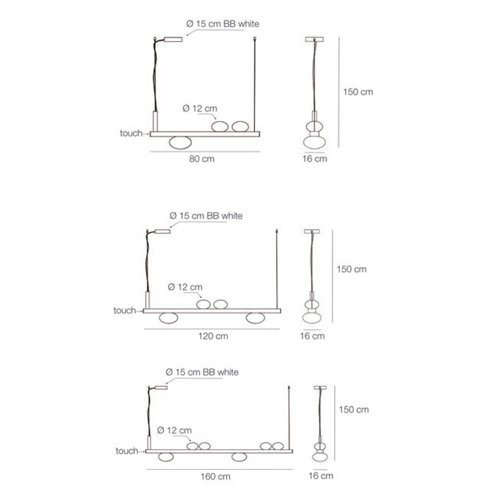 • Estructura: largo 160 x profundidad 16 cm - diámetro lámpara 12 cm - diámetro base en el techo 15 cm - altura total 150 cm - REGULABLE