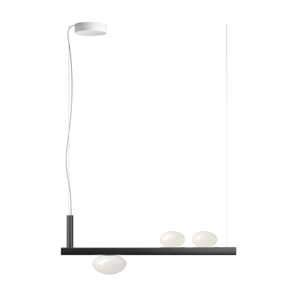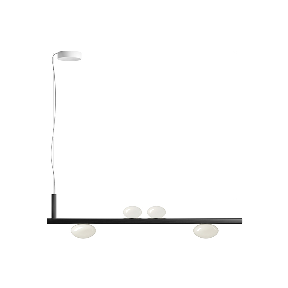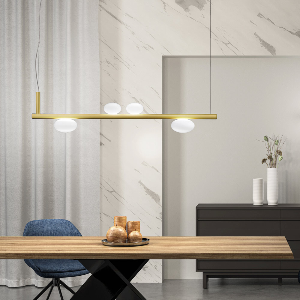 Esta lámpara colgante es un auténtico icono del diseño inteligente y la tecnología discreta . Su estructura limpia y lineal se complementa con elegantes difusores esféricos de vidrio opalino, que parecen suspendidos en equilibrio, creando un efecto visual moderno y ligero .