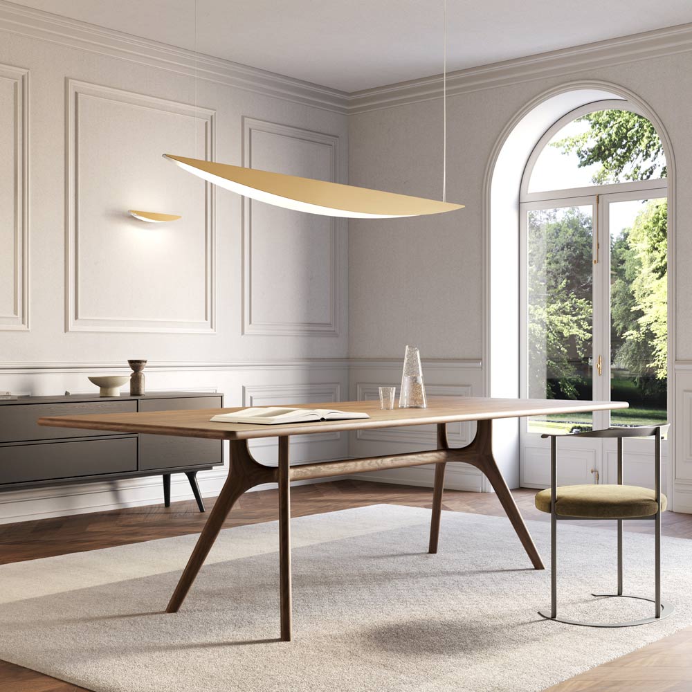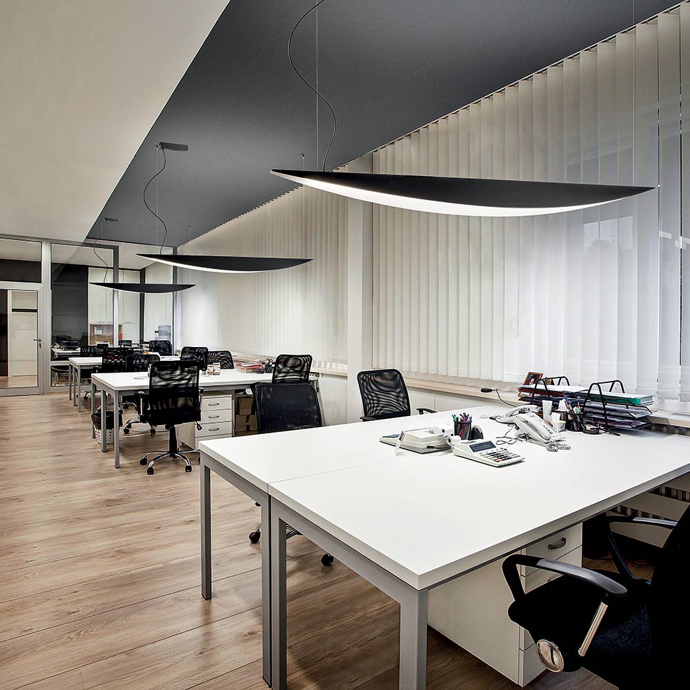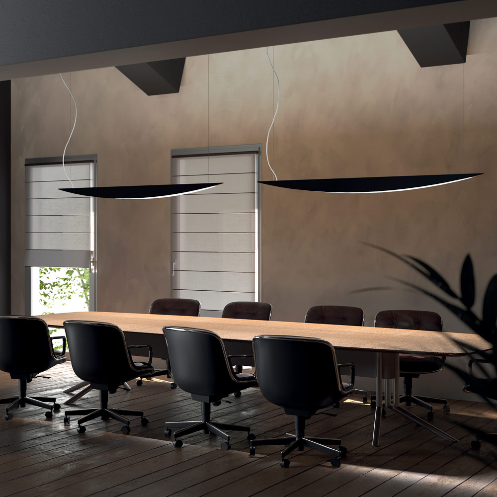 Esta lámpara colgante representa la combinación perfecta de diseño contemporáneo y funcionalidad profesional . Su forma cónica, estilizada y aerodinámica evoca un perfil de ala, aportando a la estancia una sensación de ligereza y movimiento .