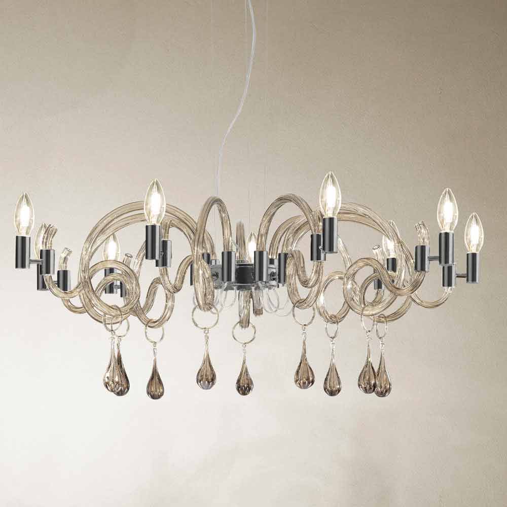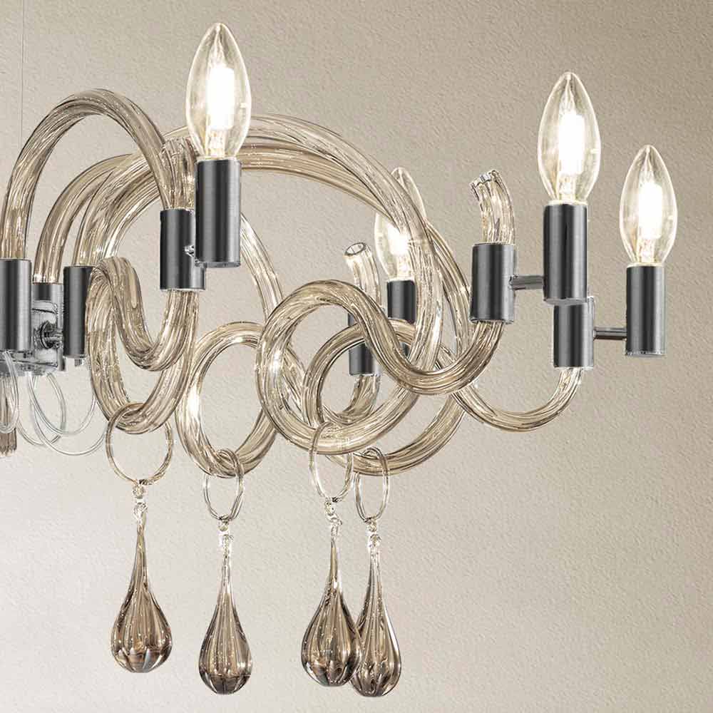 Impresionante lámpara de araña de 9 luces fabricada en Italia en vidrio veneciano ahumado hecho a mano con detalles metálicos en acabado níquel negro cepillado . Un complemento de decoración con fuerte presencia escénica que reajusta los antiguos candelabros a un molde contemporáneo gracias a un diseño tan articulado como imprescindible, ofreciendo así una solución ideal tanto para espacios modernos como ambientes de estilo clásico. Los brazos curvos y las características sinuosas de la estructura permiten que la luz viaje en diferentes direcciones, creando maravillosos juegos de luz y transparencia para un resultado de fuerte impacto visual .