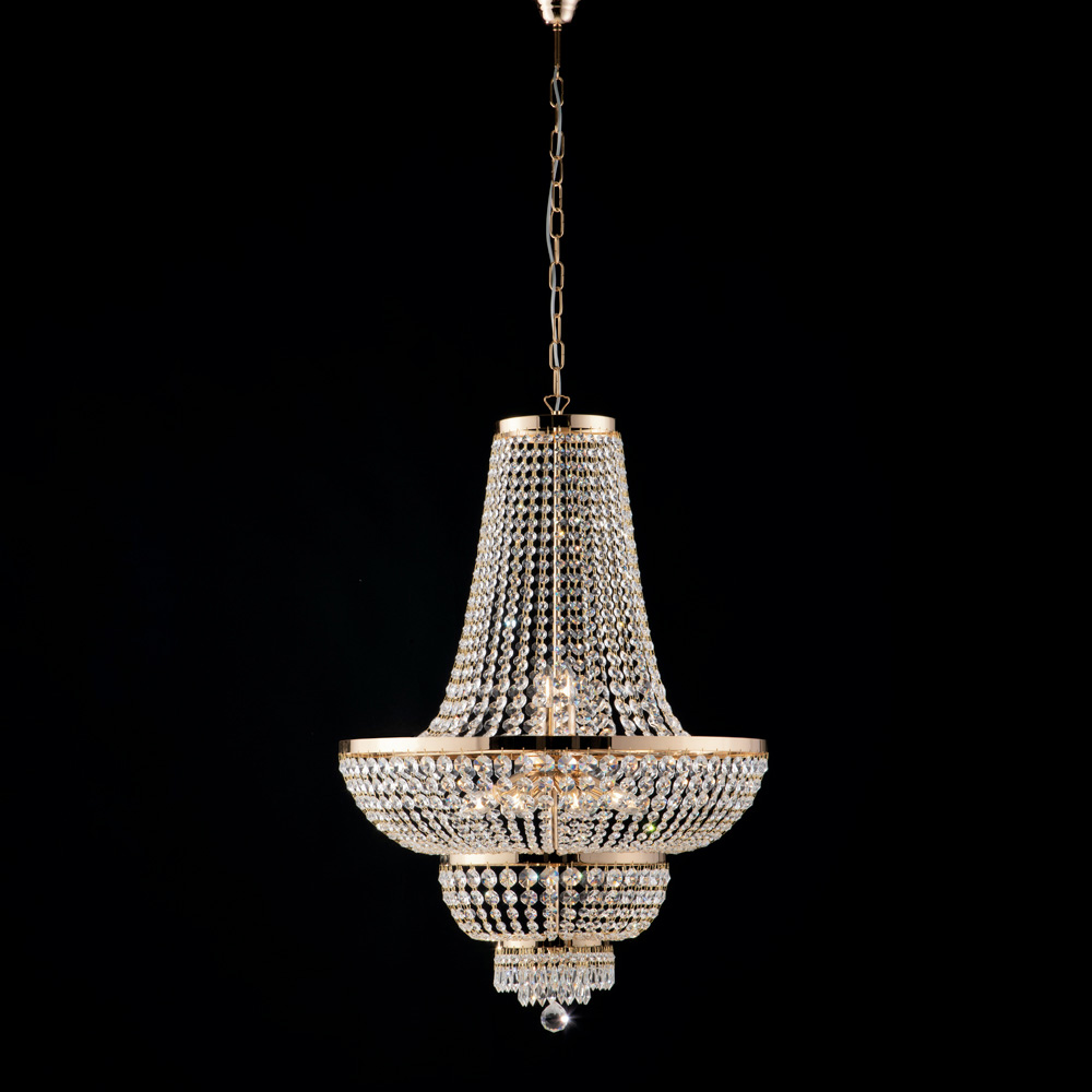 Dramática, luminosa y de gran prestigio, esta clásica lámpara de araña de lujo en hierro y latón con pedrería está diseñada para espacios que buscan destacar con elegancia. Su esbelta estructura, adornada con cascadas de brillantes pedrería , refleja la luz, creando un refinado juego de reflejos que realza cualquier espacio.