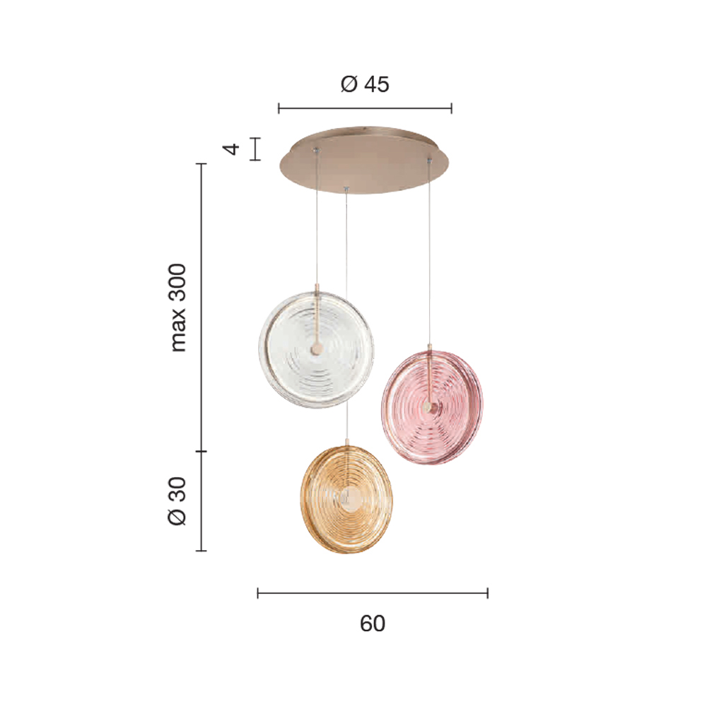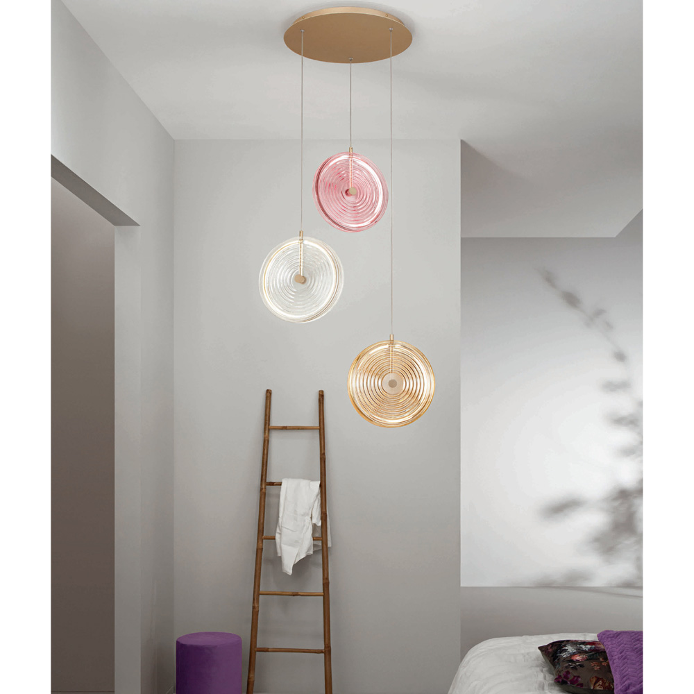 metal pintado acabado dorado, cristal decorado con líneas concéntricas de color ámbar, rosa y transparente con luz
