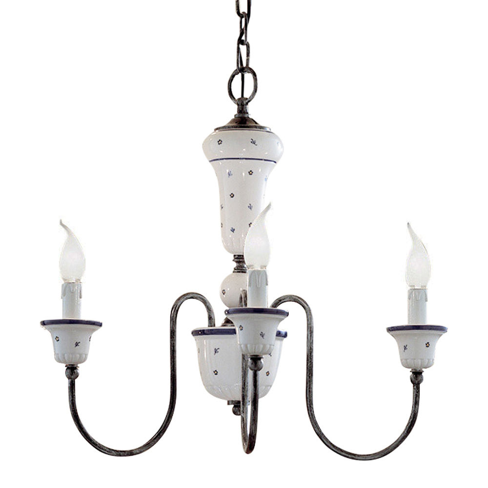 Lámpara de araña artesanal de 3 luces en latón y cerámica pintada a mano fabricada en Italia por Ferroluce.