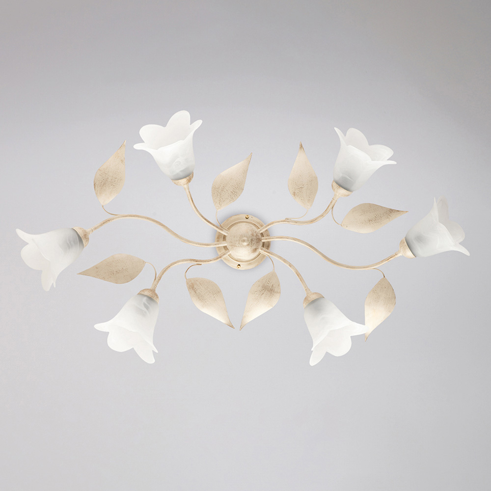 Los materiales cuidadosamente seleccionados (hierro y vidrio) aportan un efecto elegante y una agradable iluminación. Fabricada íntegramente en Italia, esta lámpara de techo es el resultado de una meticulosa artesanía que realza tanto la estética como la funcionalidad.