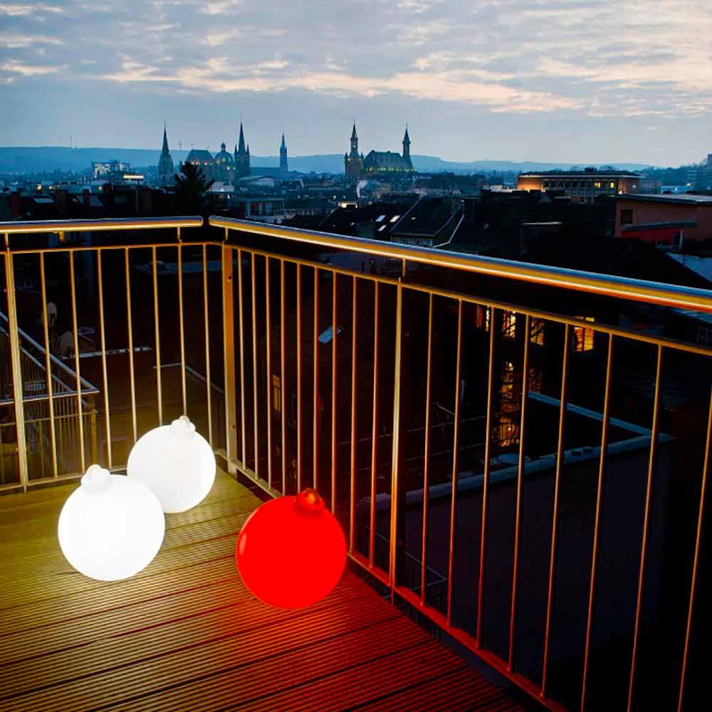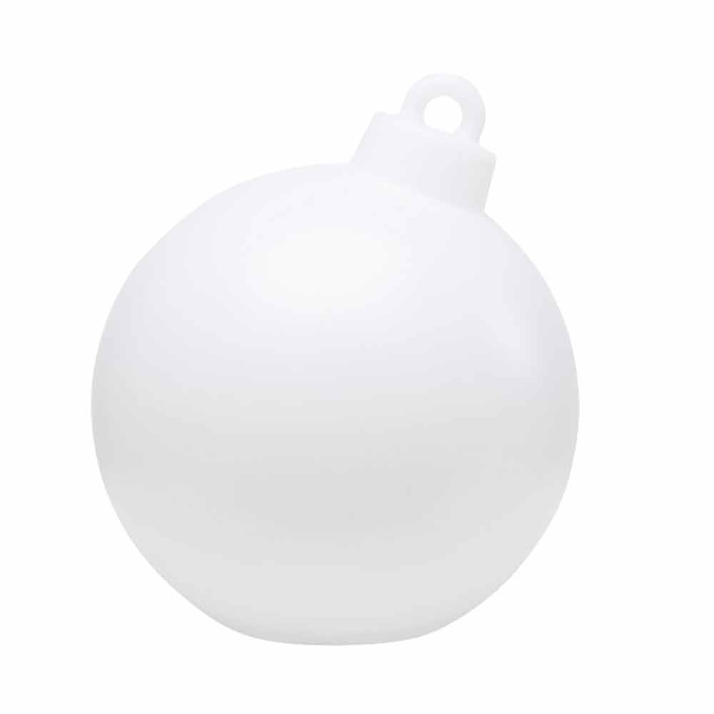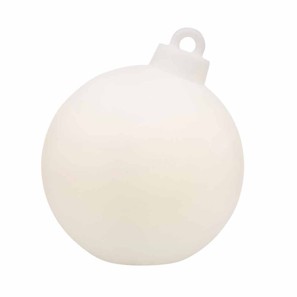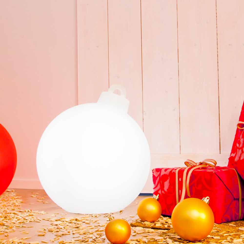 Lámpara de pie en forma de bola navideña en polietileno blanco, conexión LED multicolor, solar o E27 para interior o exterior.
