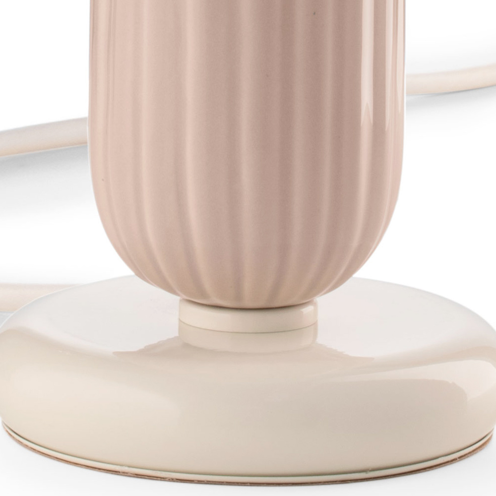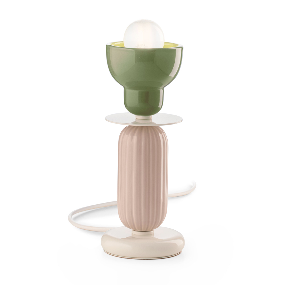 La pantalla de cerámica está diseñada para difundir una luz suave y envolvente, lo que la hace perfecta para añadir un ambiente acogedor a un rincón de lectura o como punto de luz sobre una consola en la entrada. La combinación de colores y materiales hace de esta lámpara una pieza única, capaz de adaptarse tanto a ambientes modernos como tradicionales.