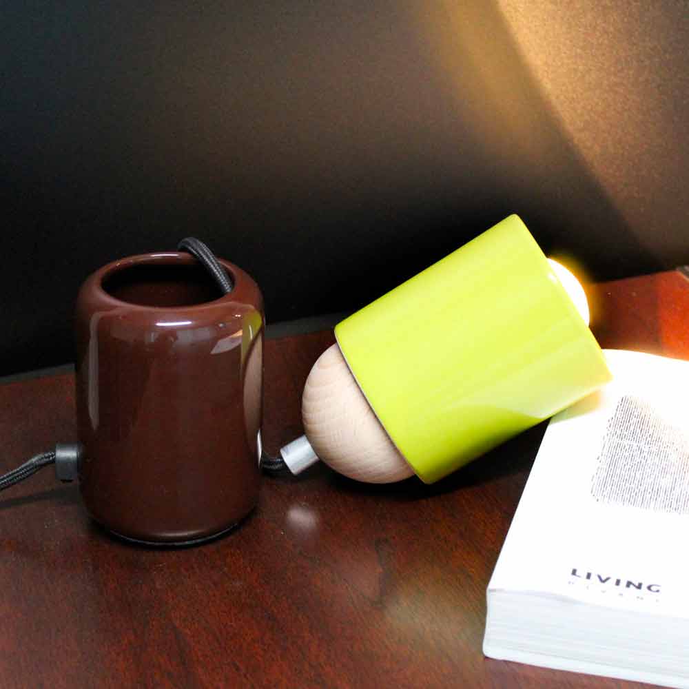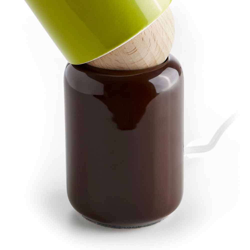 Producido exclusivamente en Italia en cerámica marrón y verde y madera de haya, su cable es negro y la abrazadera de cable es de aluminio.