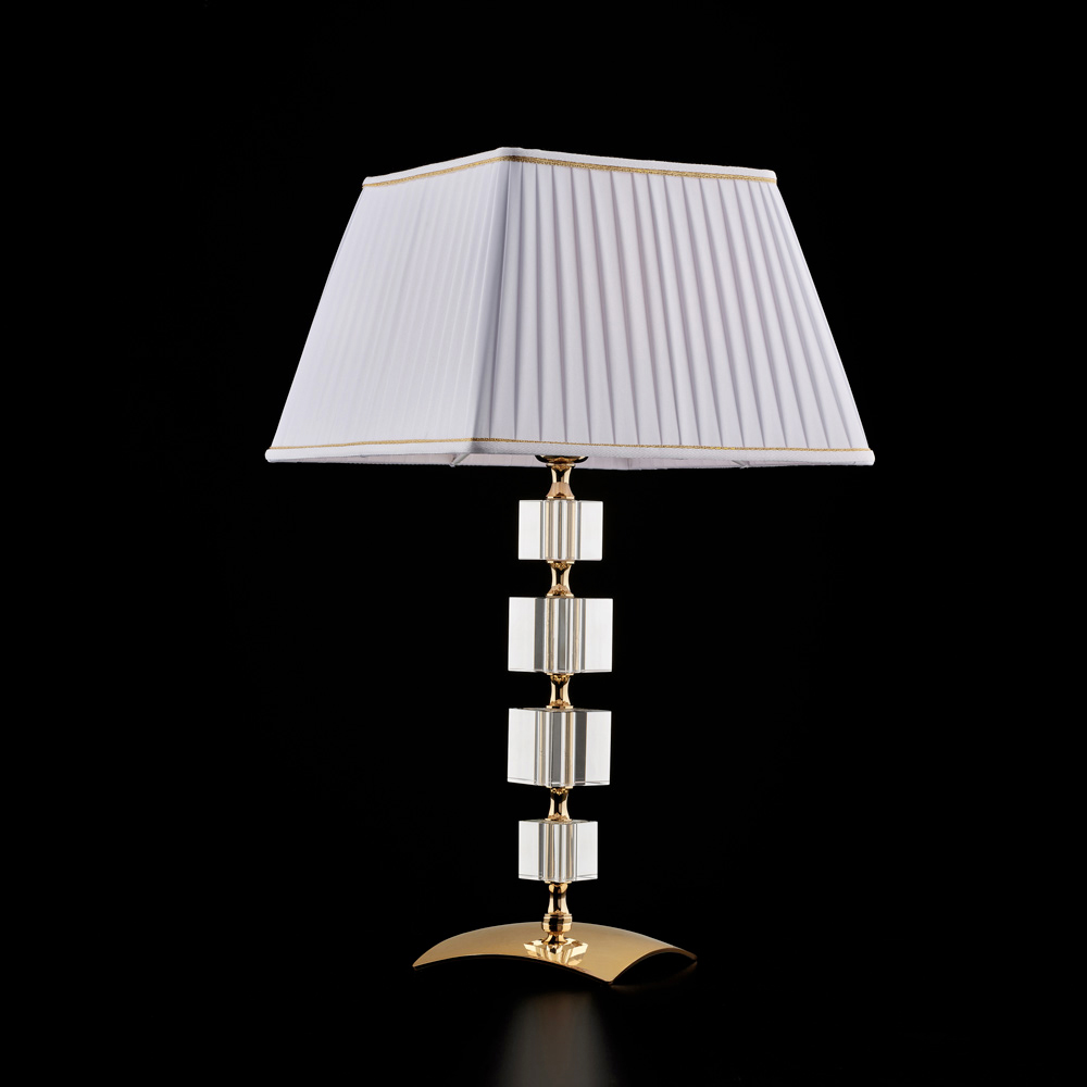 Refinadas y elegantes, estas lámparas de lujo de hierro dorado y cristal representan el equilibrio perfecto entre el diseño clásico y el gusto contemporáneo. Su esbelta estructura, adornada con elementos geométricos de cristal , se complementa con una pantalla de tela plisada que difunde una luz suave y envolvente, creando una atmósfera cálida y sofisticada.
