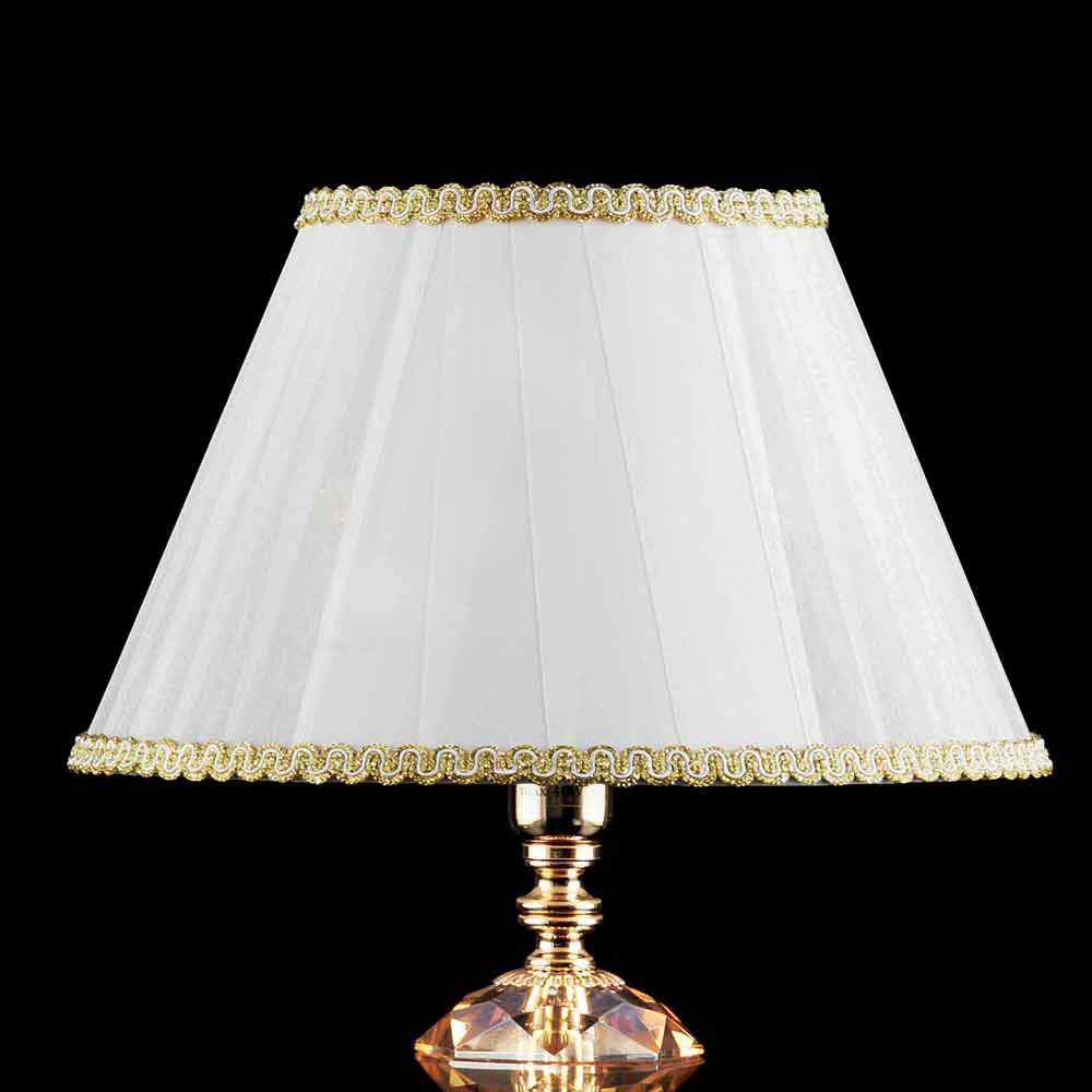 Lámpara de diseño clásico en cristal y cristal ámbar, acabado dorado. Pantalla de organza y pongè.