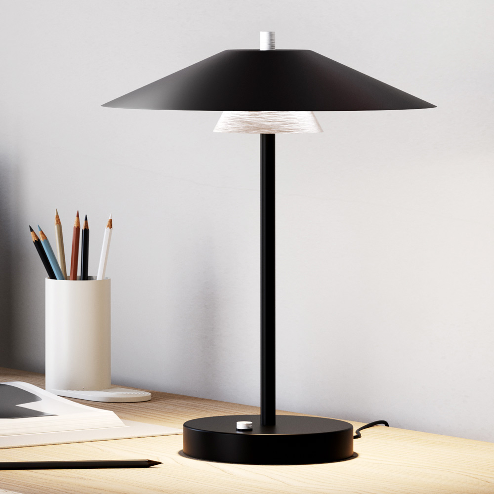 Esta lámpara de mesa táctil combina a la perfección diseño contemporáneo , funcionalidad avanzada y elegancia minimalista . Su estilizada silueta, con pantalla cónica invertida y base compacta, se integra a la perfección en entornos domésticos y profesionales .