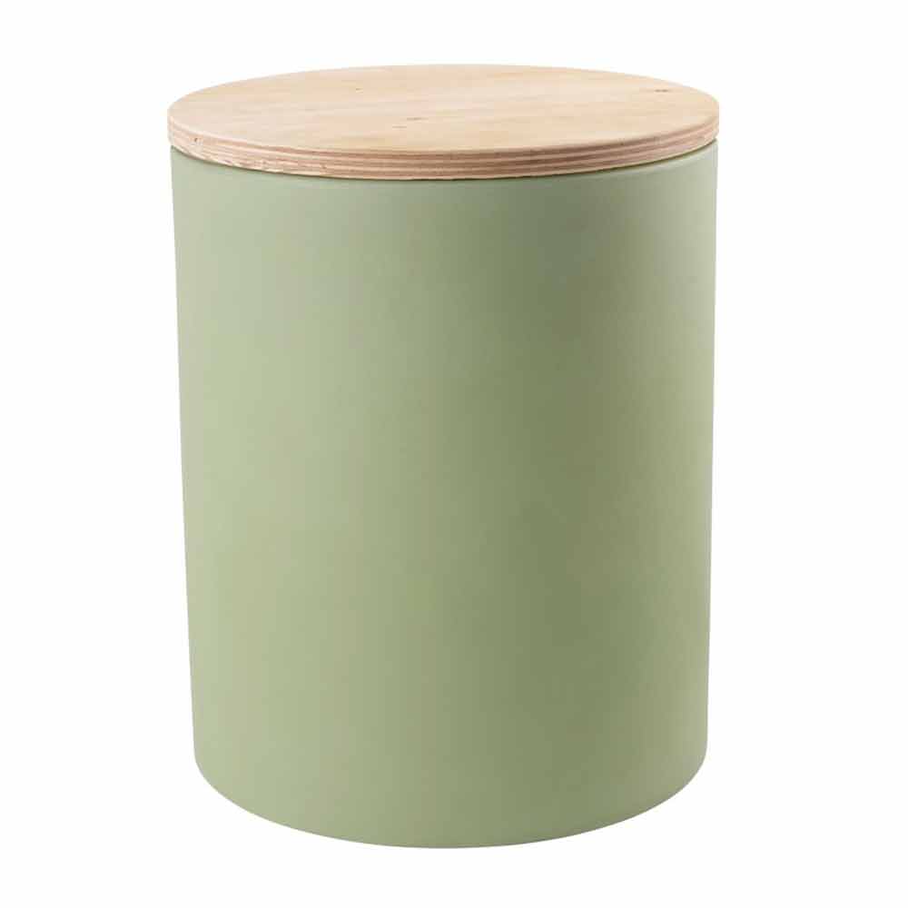 Mesa baja cilíndrica brillante en polietileno de colores con tapa de madera para el jardín o el salón de diseño moderno.