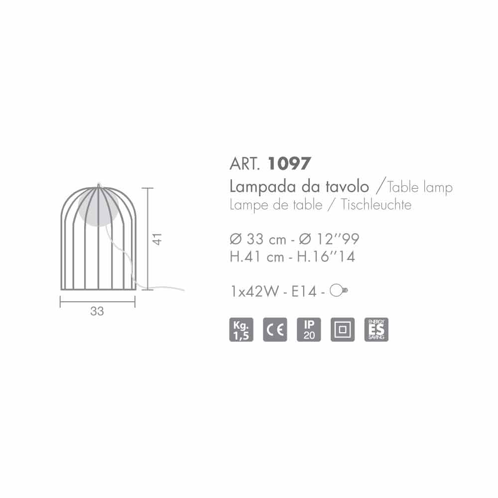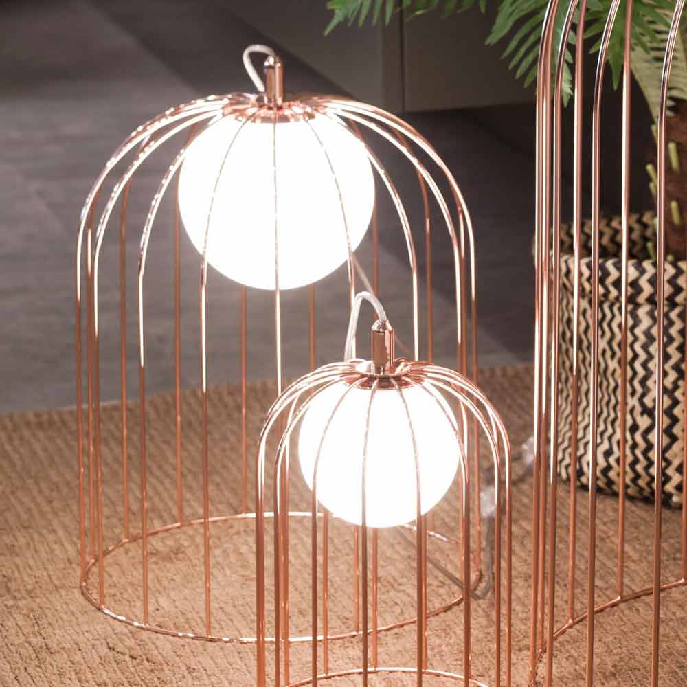 Kluvì es una lámpara de mesa compuesta por una jaula de metal y una esfera de vidrio soplado de color blanco lechoso. Acabado: cobre pulido; preparado para el 'utiizzo 1 42W bombilla - E14.
