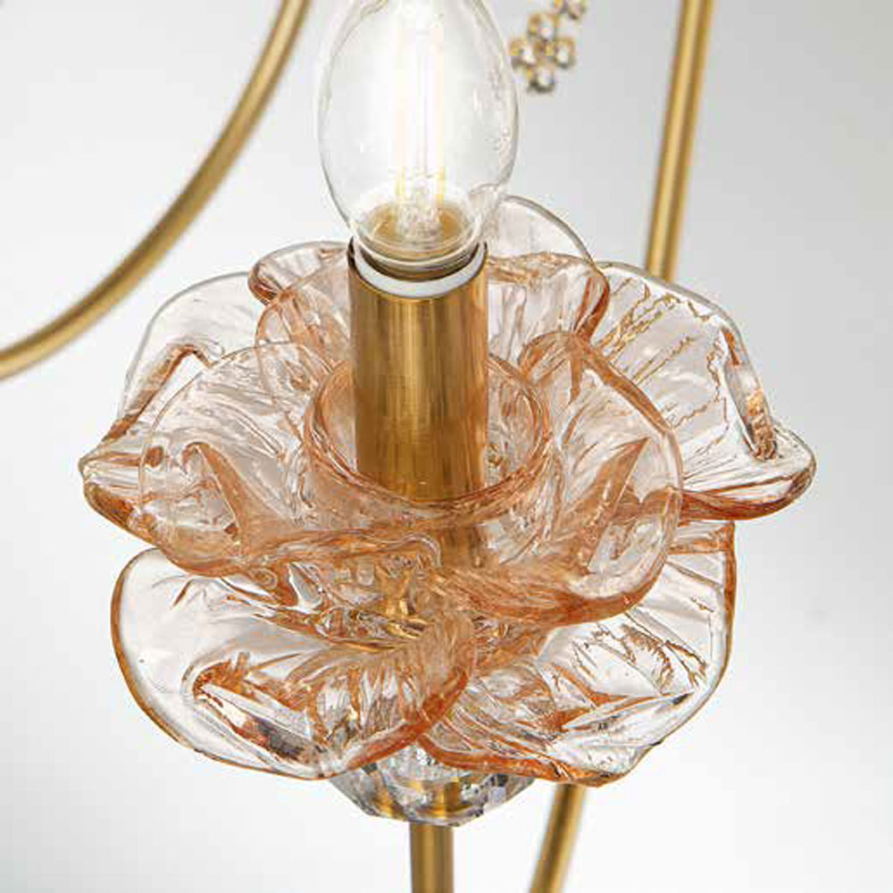Lo que la hace única y majestuosa son los capullos elaborados en vidrio artesanal de la más alta calidad y los detalles joya en cristal que recuerdan las gotas de rocío, también artesanales, que dan vida a un estilo clásico del pasado, cuyo encanto se convierte en protagonista en el espacio de destino.