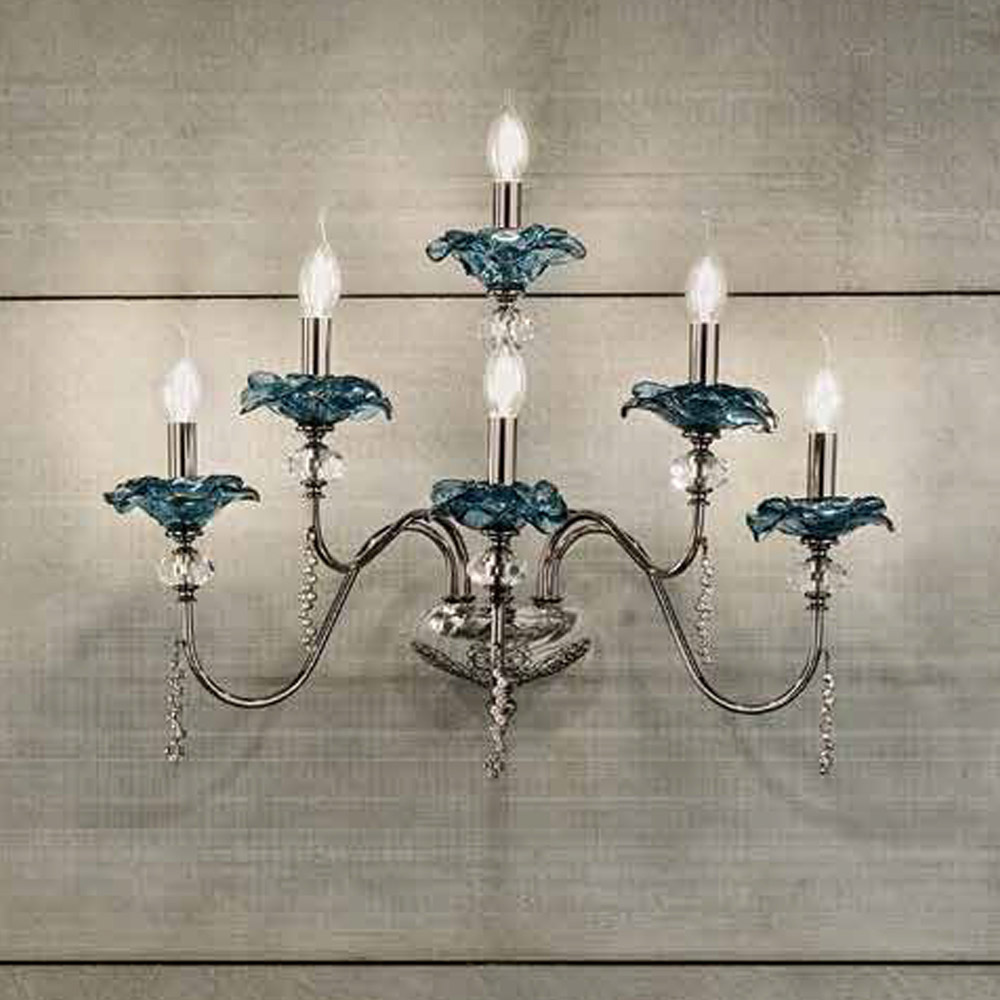 El aplique de 6 luces es un accesorio de iluminación de lujo totalmente hecho a mano en Italia con estructura de metal con soldadura de plata.