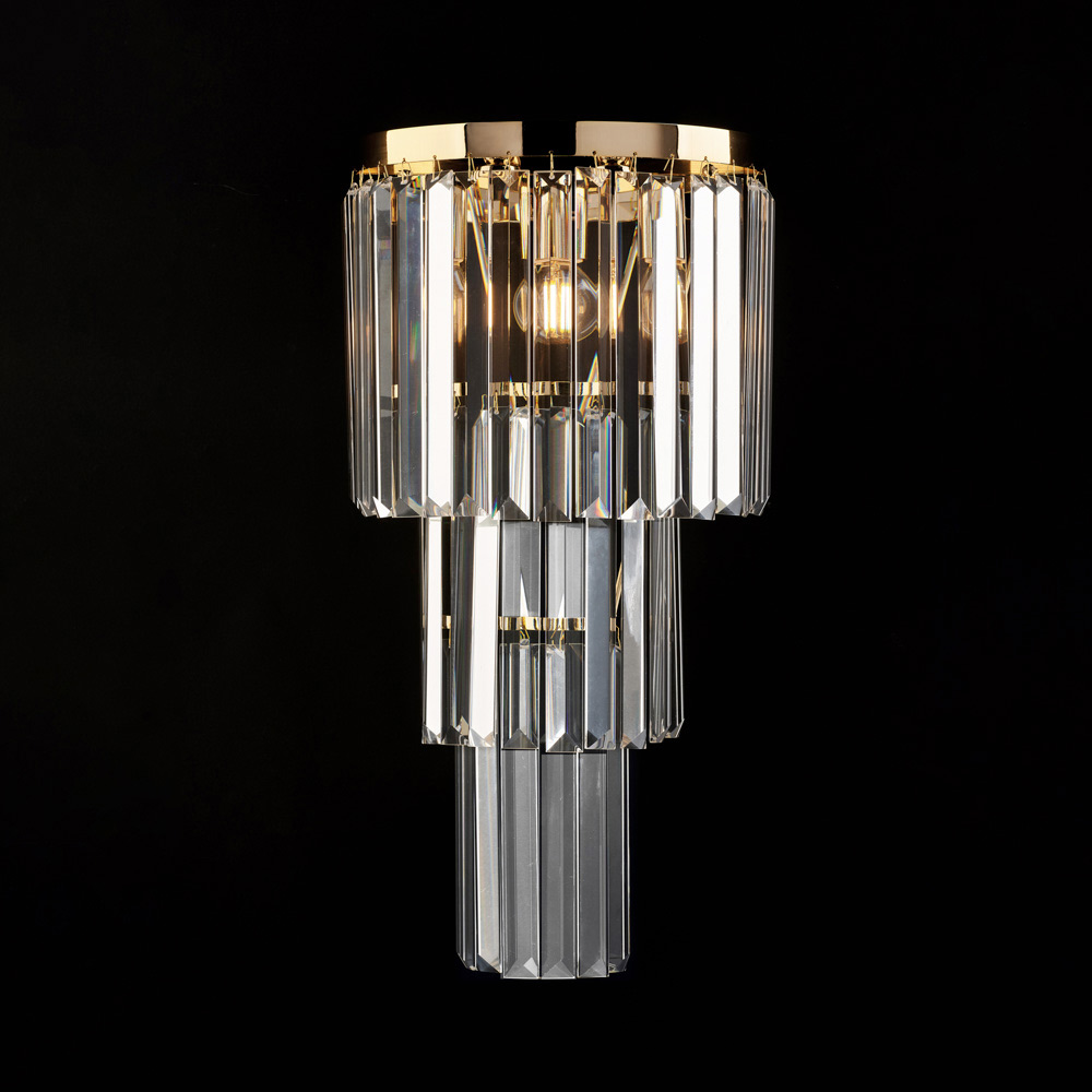 Elegante y espectacular, este lujoso aplique de pared de hierro y latón dorado con pedrería es un refinado elemento de iluminación diseñado para realzar las paredes con una luz cálida y envolvente. La estructura vertical, desarrollada en varios niveles, está adornada con elementos de pedrería transparente que crean un sofisticado juego de reflejos, aportando profundidad y carácter al espacio.