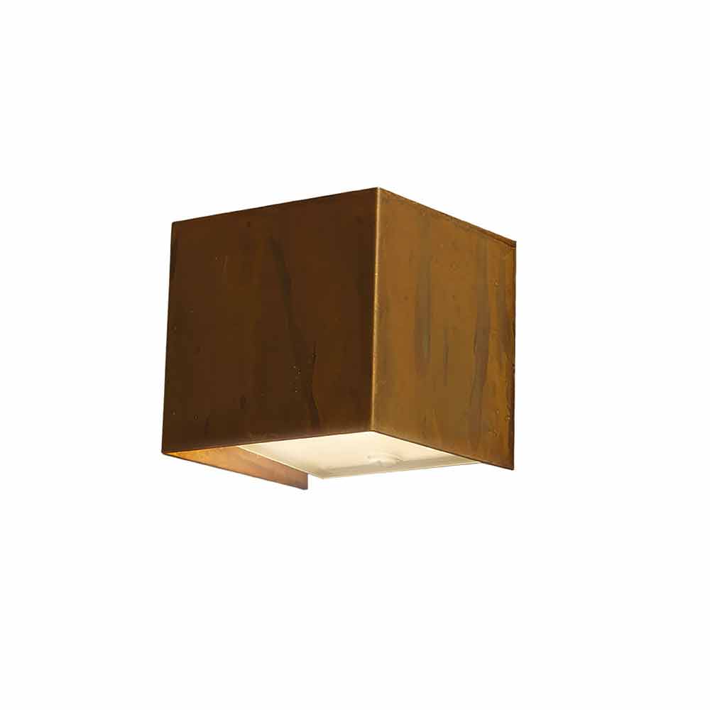 Lámpara de pared con estructura de bronce oxidado. Disponible en dos tamaños en forma redonda o cuadrada. Difusor de vidrio templado para emisión de luz directa e indirecta.