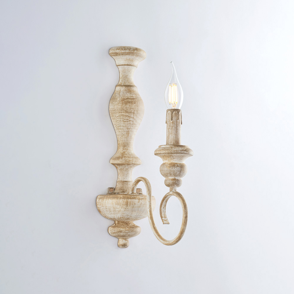 Elegante y armonioso, este aplique artesanal de madera y hierro interpreta con elegancia el estilo shabby chic , combinando formas clásicas y acabados delicados. Su esbelta estructura, realzada por brazos sinuosos y luces tipo vela , aporta a las paredes una elegancia ligera y atemporal, ideal para crear ambientes cálidos y acogedores.