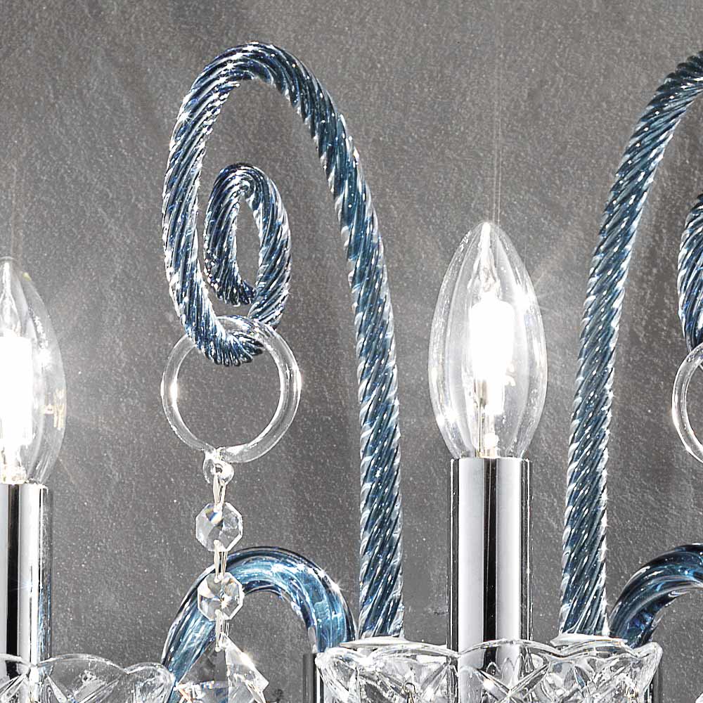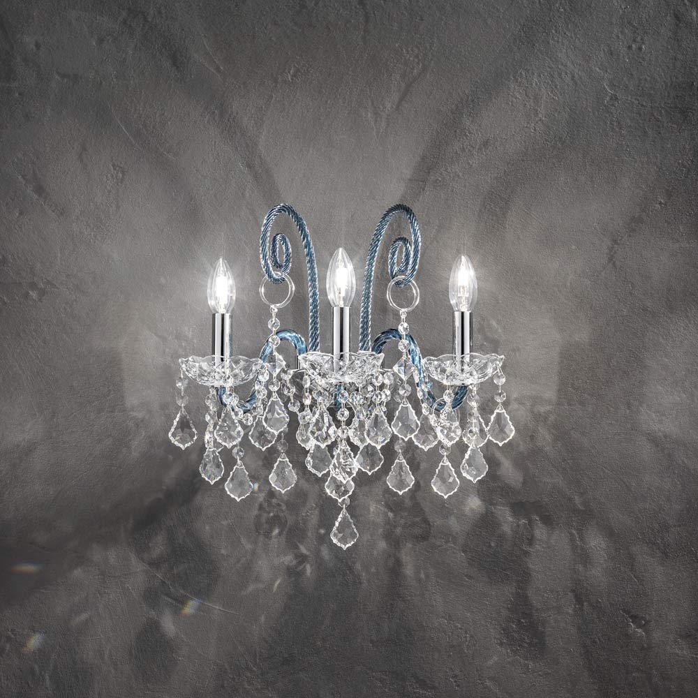 Aplique artesanal de 3 luces en cristal veneciano acabado denim con colgantes de plomo y detalles en metal cromado pulido . Caracterizada por los maravillosos brazos trabajados a mano mediante la técnica del torcido que crea un resultado exclusivo que recuerda estéticamente el entrelazado de una cuerda, esta lámpara dota de personalidad a todo el entorno que la rodea. Una verdadera lluvia de luz invade la estructura de la araña y luego se esparce por el ambiente que la rodea por medio de la refracción a través de la magia de las lentejuelas y los colgantes de cristal con finos acabados, creando así un efecto escenográfico evocador y onírico capaz de encantar y sorprender. por su elegancia y majestuosidad .