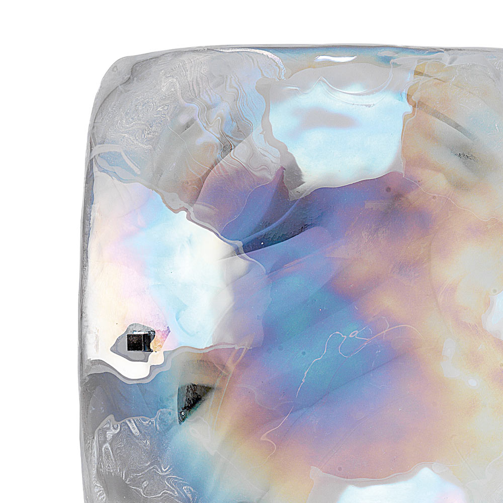 Una pequeña obra de arte con una estética intrigante realizada en placa de vidrio blanco rayado con decoración de iris (efecto nácar) que le da al ambiente un toque de refinada elegancia gracias a la textura particular y al efecto visual inédito creado por el vidrio para una resultado con gran personalidad.