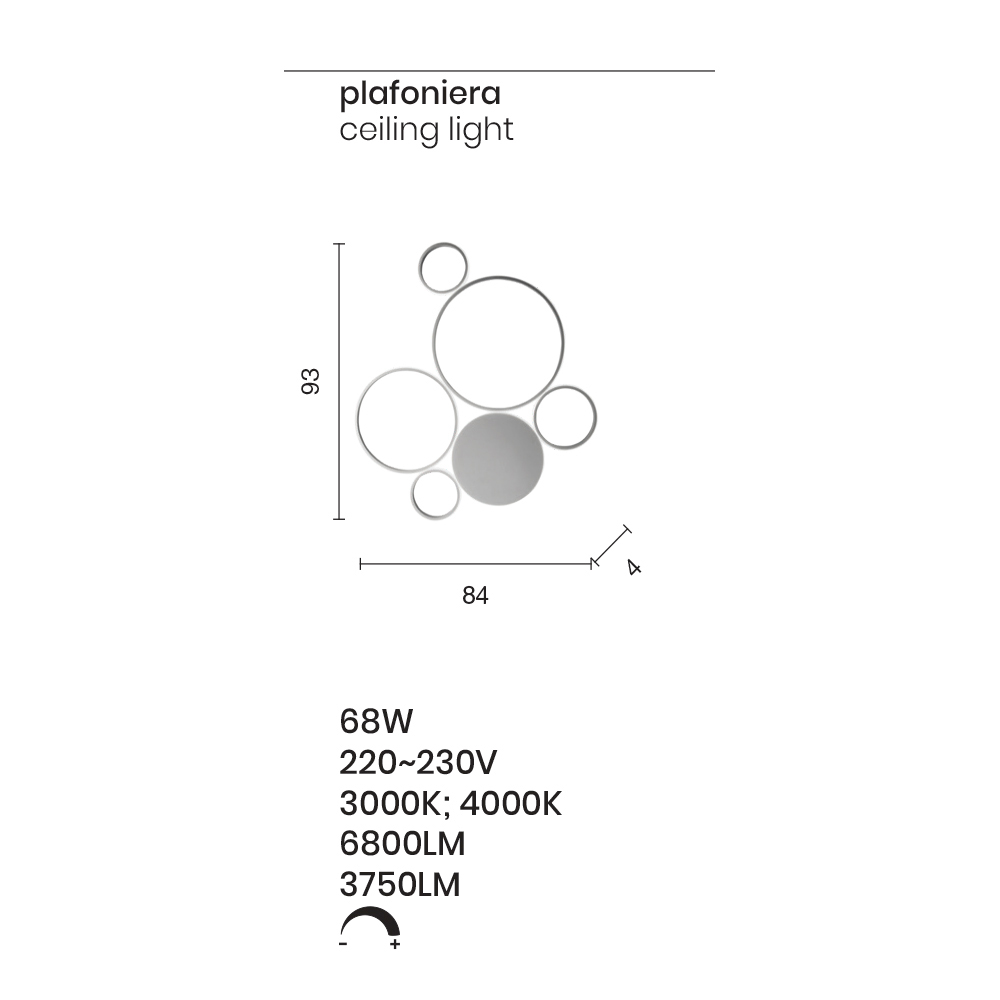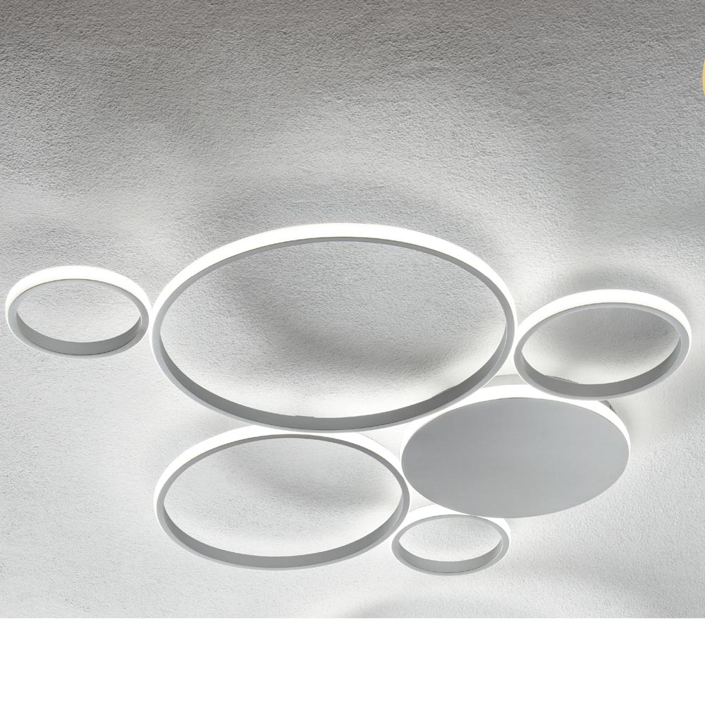 fuente LED regulable. Una original composición formada por círculos de diferentes tamaños unidos entre sí y cubiertos en el exterior por un difusor blanco lechoso que encierra la tira de led, creando maravillosos efectos de luz en las paredes para un resultado de