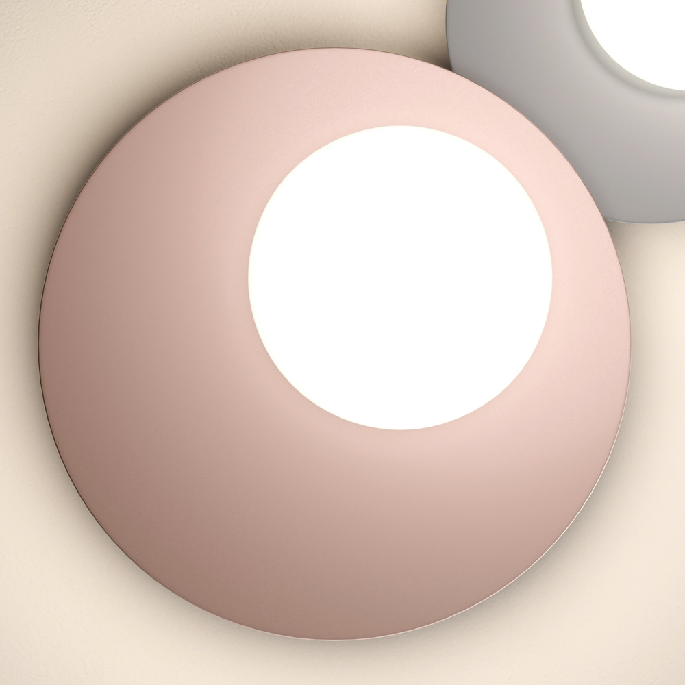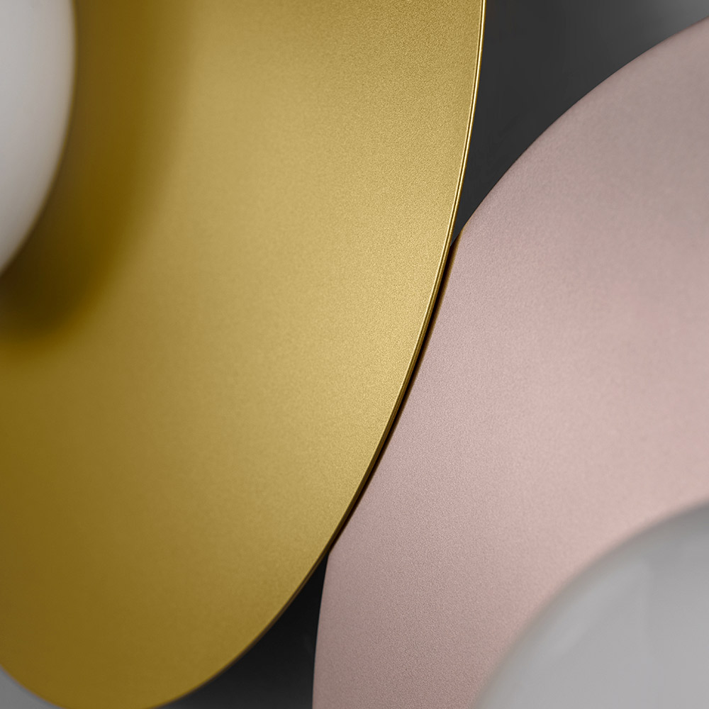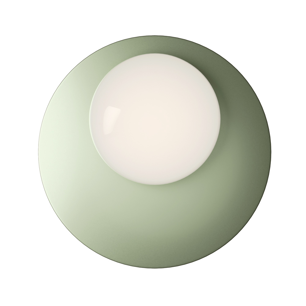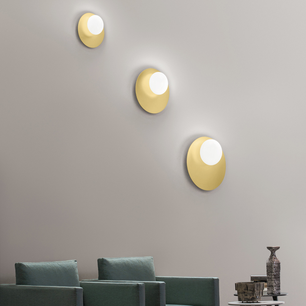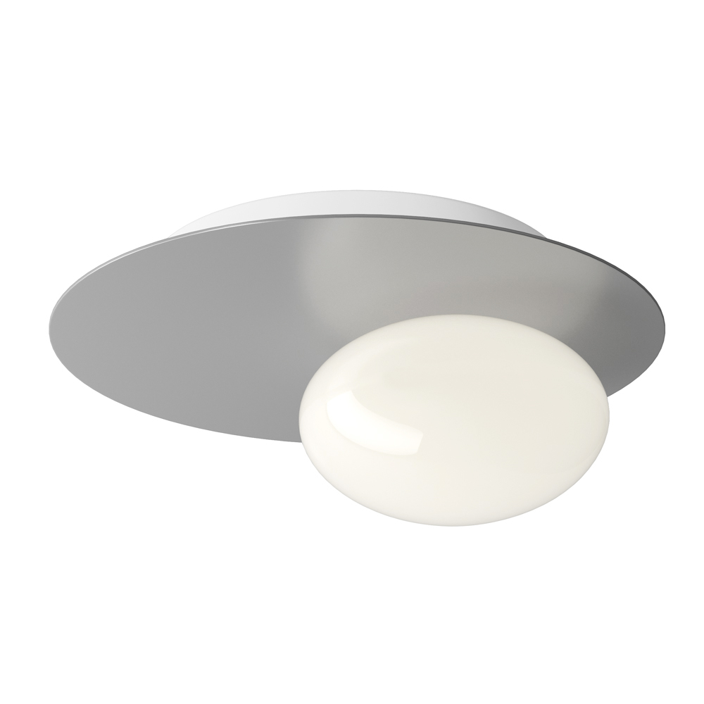 Aplique de pared de interior realizado con estructura de aluminio reciclable, florón metálico y lámpara de cristal soplado en color blanco lechoso.