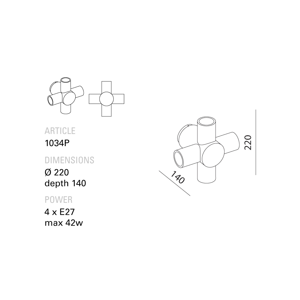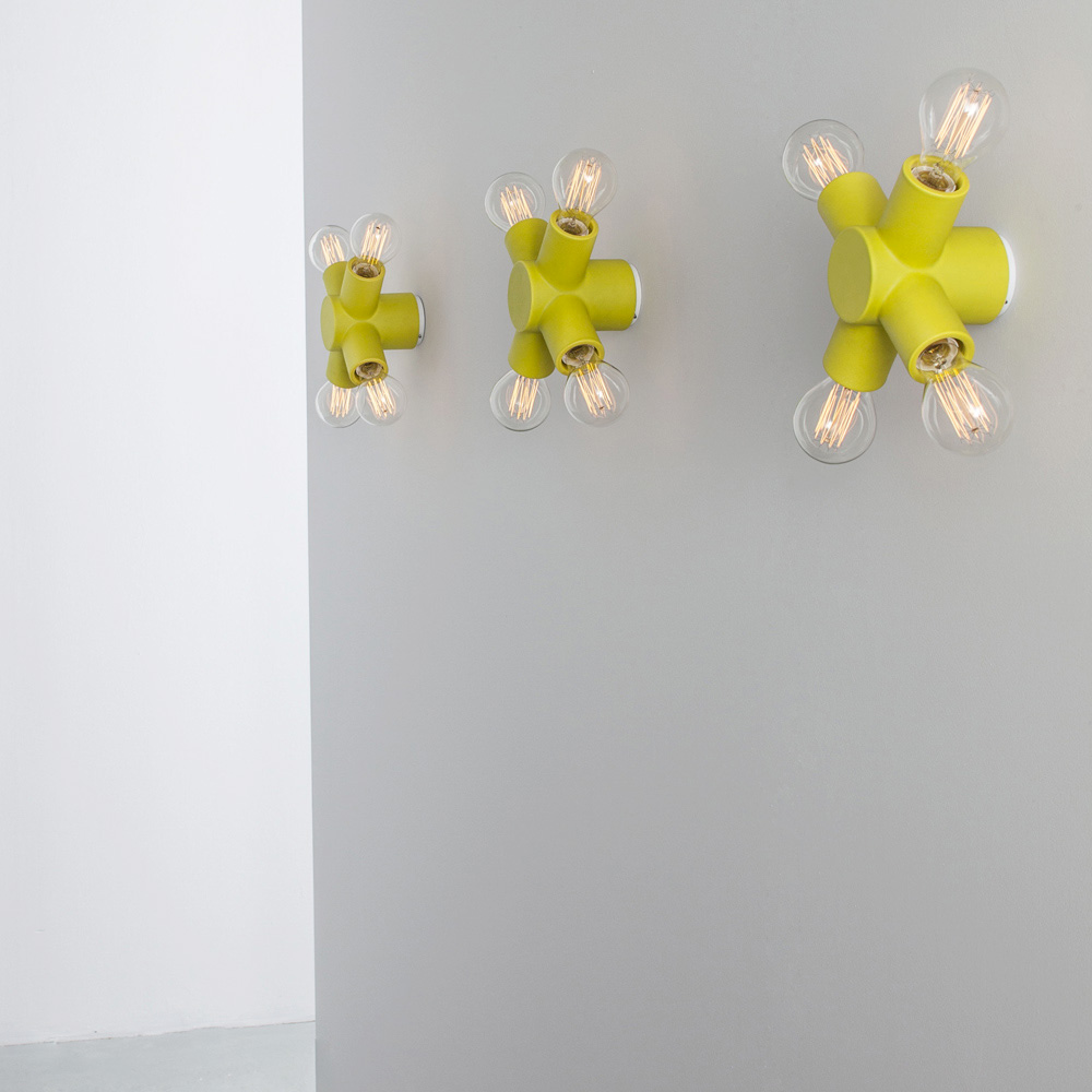 El modelo está formado por un cilindro central que contiene la conexión eléctrica, del que se ramifican otros cilindros laterales en diversas posiciones. Está hecho de cerámica blanca fundida, pintado con esmalte y cocido dos veces a más de 1000 grados. Los componentes metálicos son de varios colores, incluido el blanco y el naranja, inspirado en los primeros productos industriales de los años 60, o el verde fluorescente como la ropa de advertencia de quienes trabajan en las carreteras.