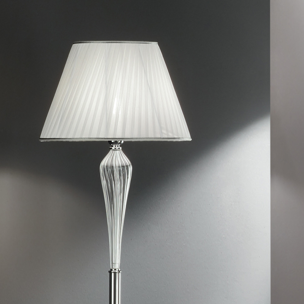 La característica peculiar viene dada por los preciosos motivos producidos en vidrio hechos a mano en Italia con un efecto "rigaton" que revela el núcleo de metal y que sostiene la pantalla en tela blanca con efecto plisado .