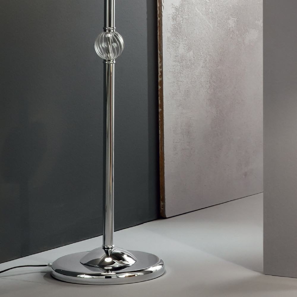 Esta lámpara de pie de estilo clásico está realizada con una base redonda y una parte de la estructura realizada en metal cromado.