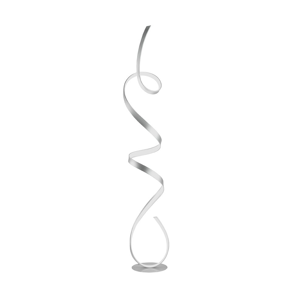 Lámpara de pie con estructura de metal pintado plateado y luz LED.