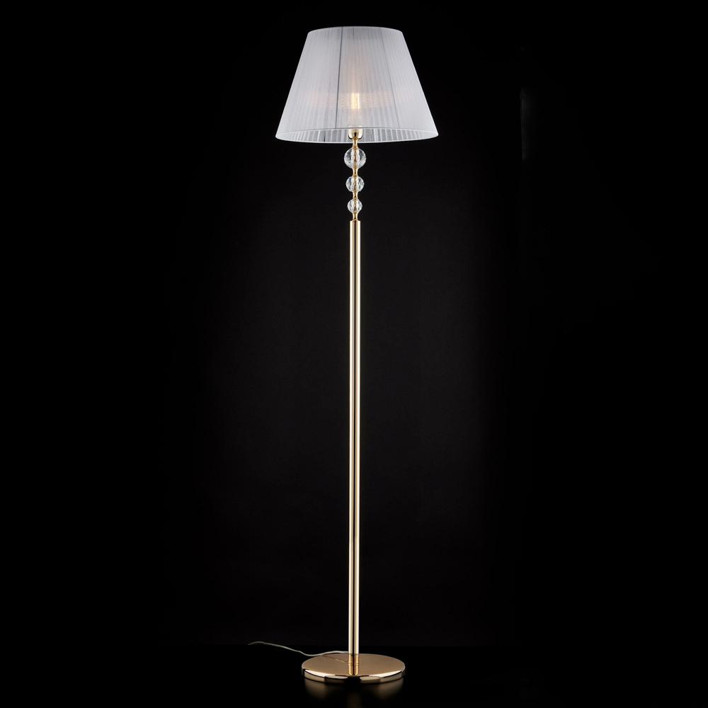 Esbelta y elegante, esta clásica lámpara de pie de lujo en hierro dorado y cristal es una solución de iluminación de gran refinamiento, diseñada para realzar los espacios con una luz suave y envolvente. La estructura vertical, adornada con elementos de cristal transparente , aporta luminosidad y ligereza al diseño, mientras que la pantalla de tela difunde delicadamente la luz, creando una atmósfera cálida y sofisticada.