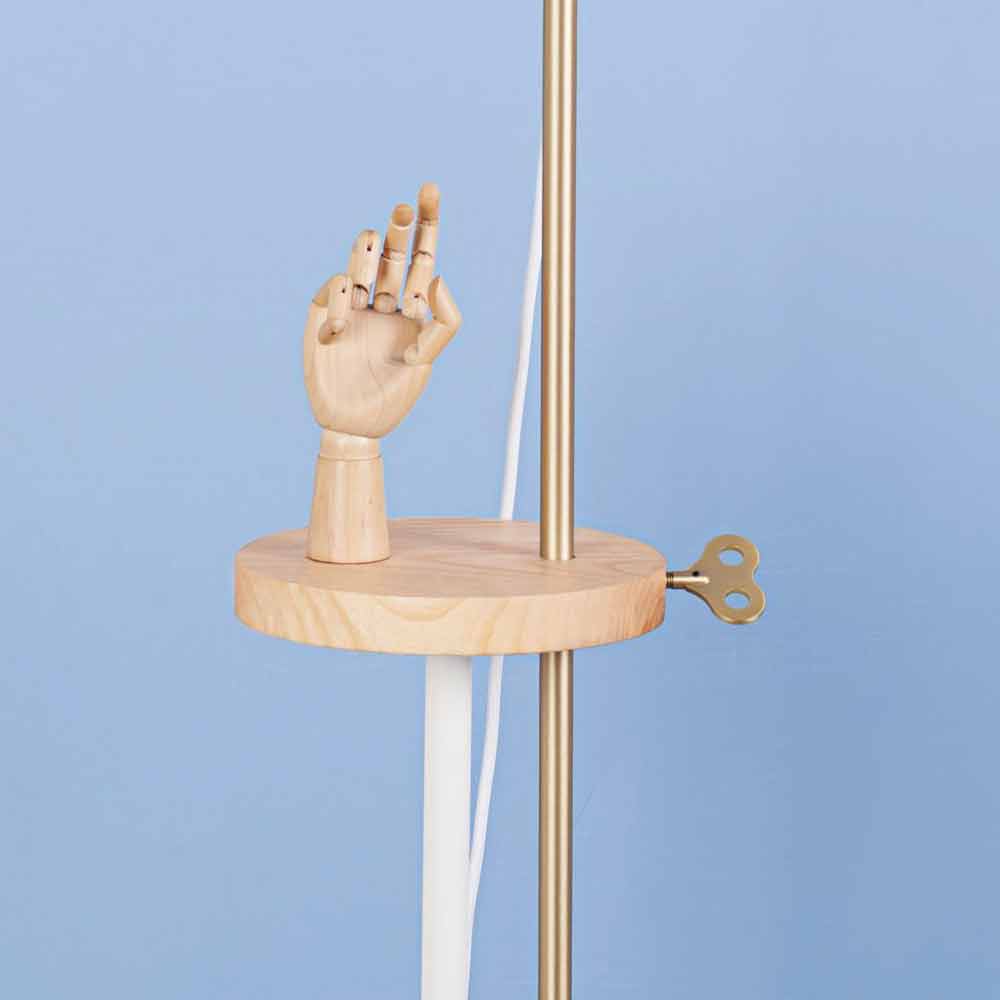 madera de fresno útil como superficie de apoyo pero también y sobre todo como elemento técnico fundamental para mover la parte luminosa a varias alturas. El inserto en forma de llave fabricado en
