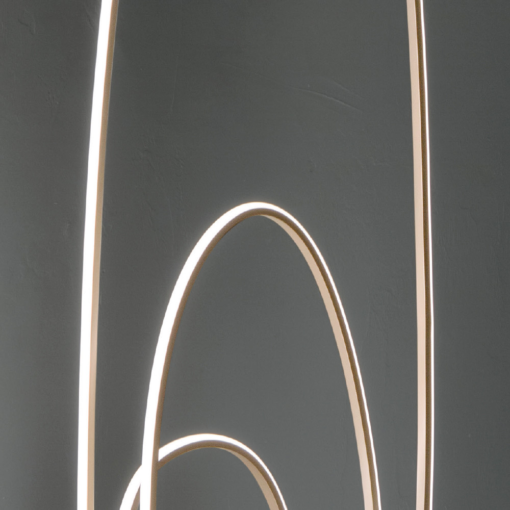 Lámpara de pie moderna fabricada en metal pintado acabado doradocon fuente LED integrada regulable. Una lámpara de pie con un diseño moderno y cautivador concebida para amueblar e iluminar cualquier espacio doméstico con un toque original y refinado . Su estructura se desarrolla en un vórtice vertical compuesto por una línea continua que recrea círculos elípticos dando vida a un complemento de estilo particularmente refinado y exclusivo. Capaz de brindar una iluminación de calidad a través de una luz cálida y acogedora , esta lámpara demuestra al mismo tiempo un excelente elemento decorativo perfecto para quienes aman enriquecer su hogar con objetos de diseño exclusivos.