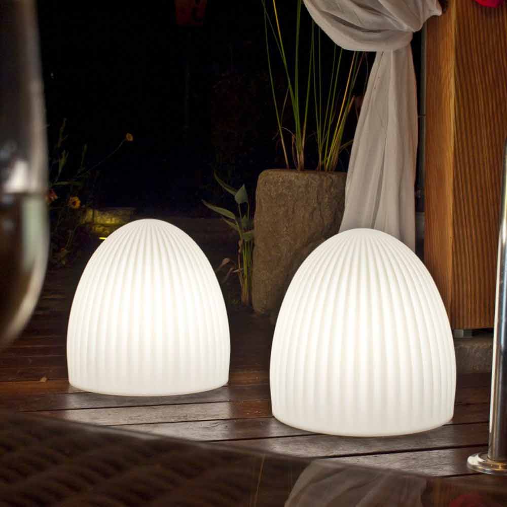 Lámpara de pie de diseño moderno en polietileno blanco para espacios interiores o exteriores con conexión LED, solar o E27.