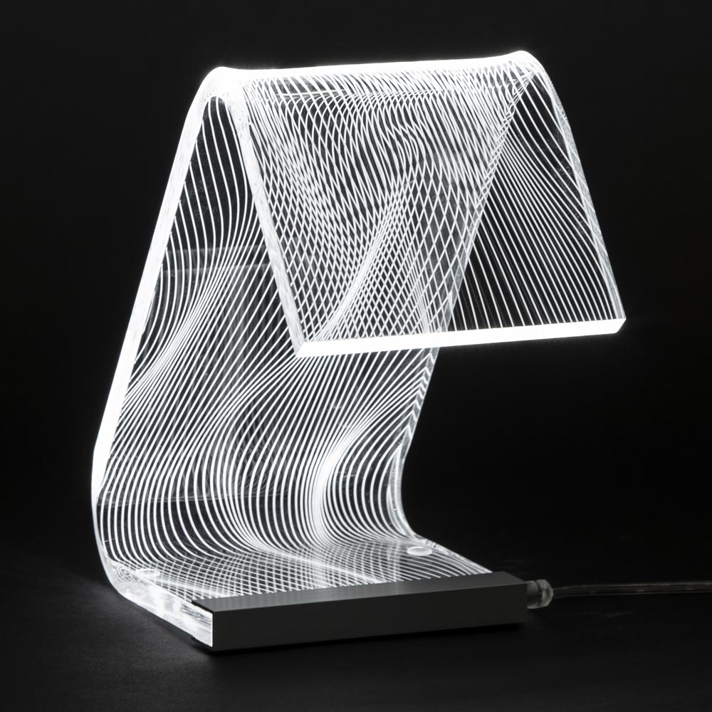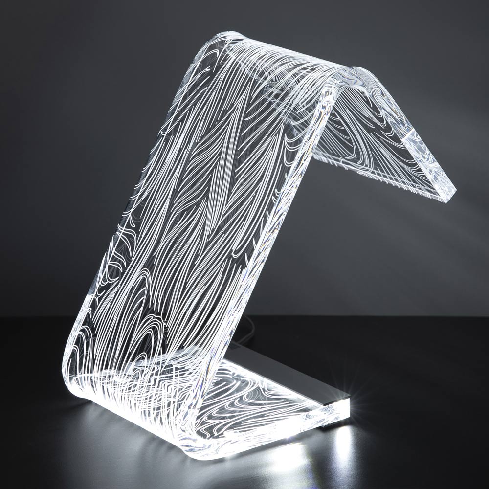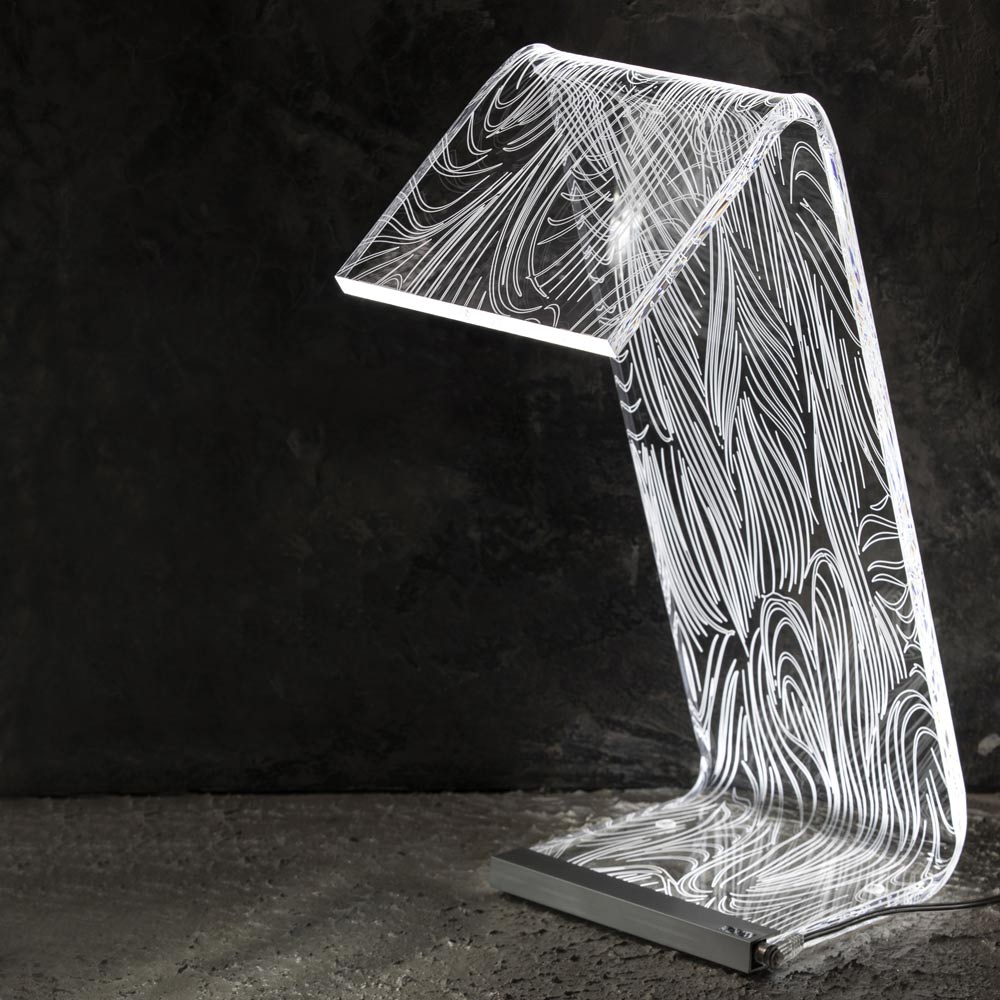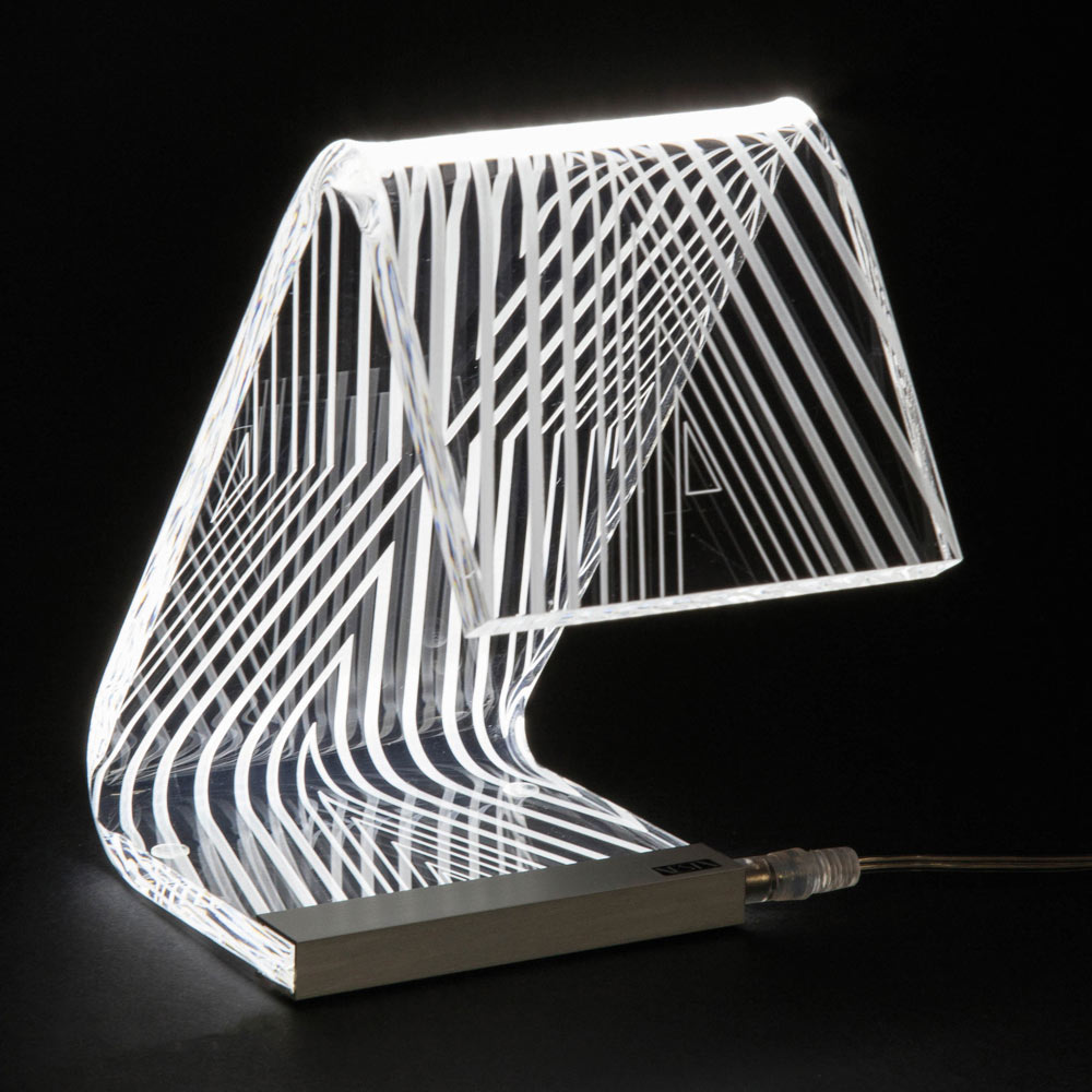 Esta lámpara de mesa   Está realizada íntegramente en cristal acrílico transparente y curvado a mano de 10 mm de espesor y se caracteriza por grabados láser en la superficie que, a través de una tira de LED colocada en la base, se iluminan a lo largo de toda la longitud del cuerpo luminoso, creando un extraordinario juego de efectos posible gracias a las características físico-técnicas del cristal acrílico.