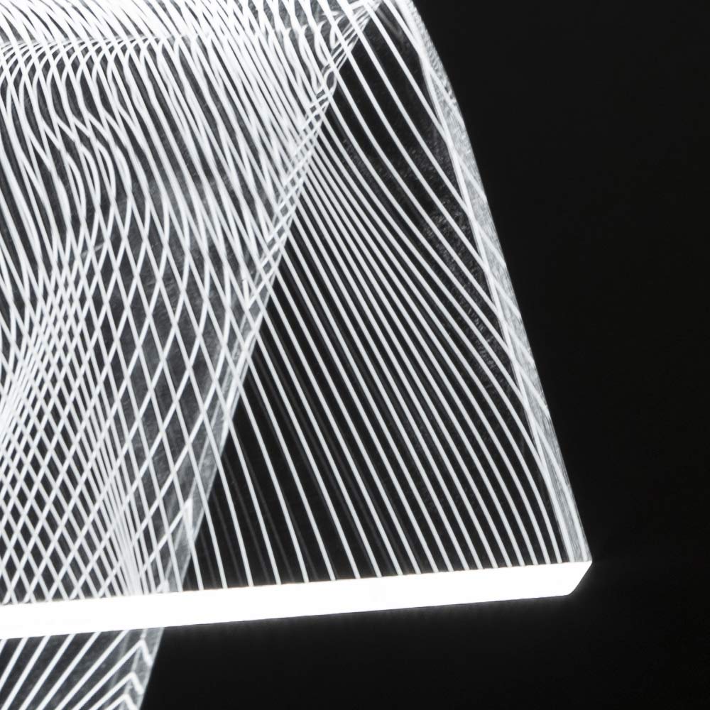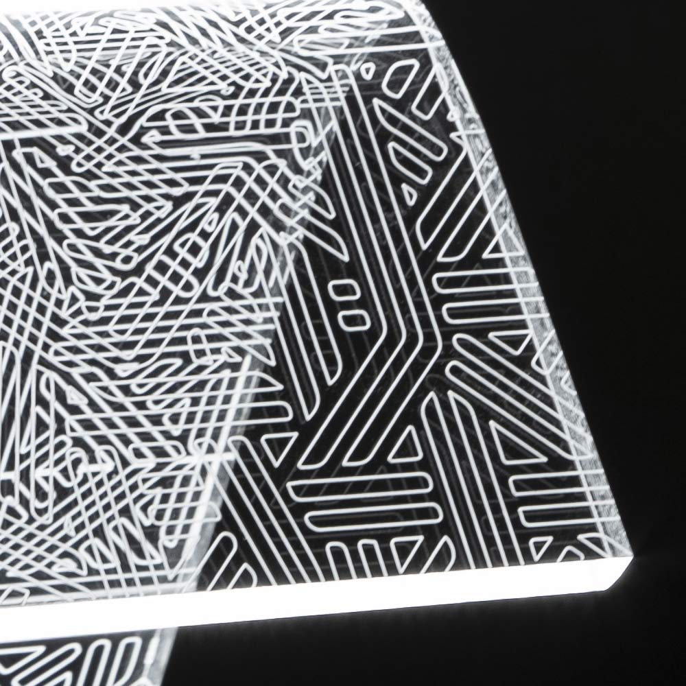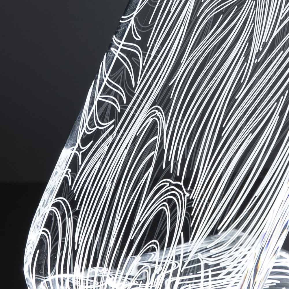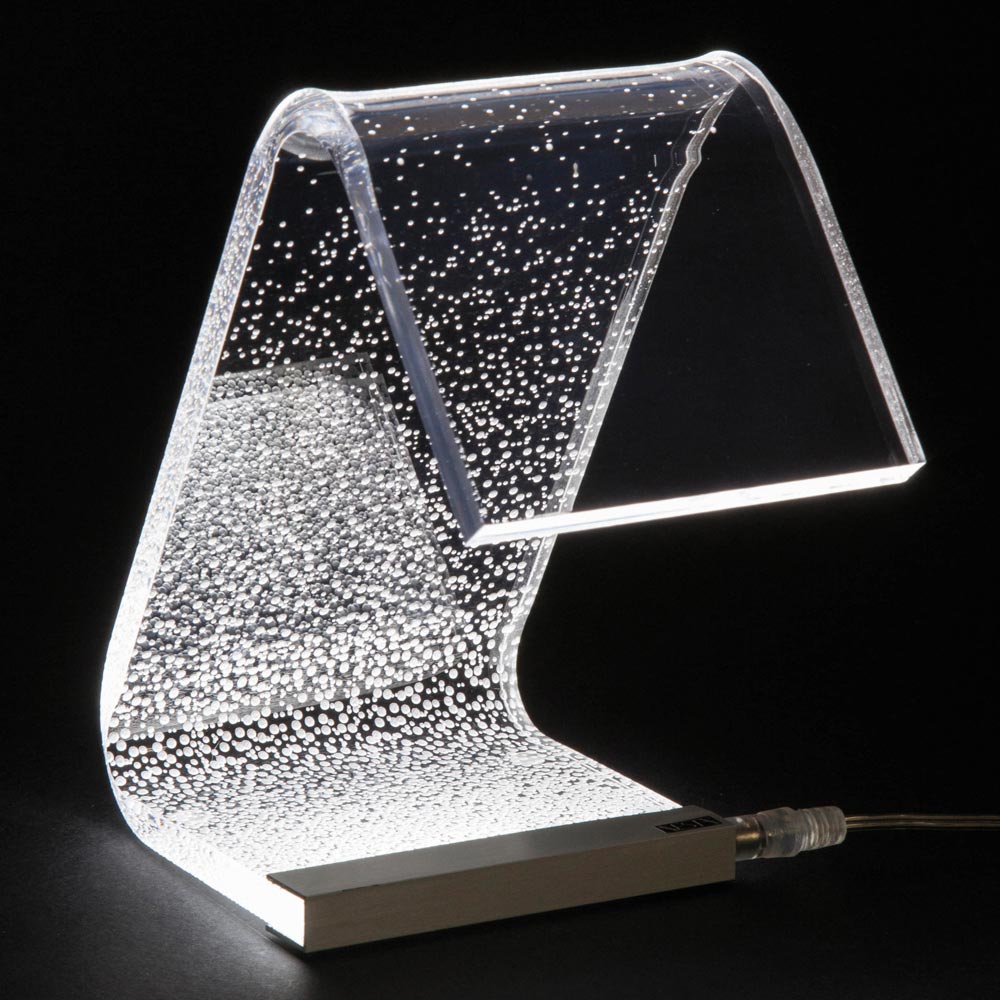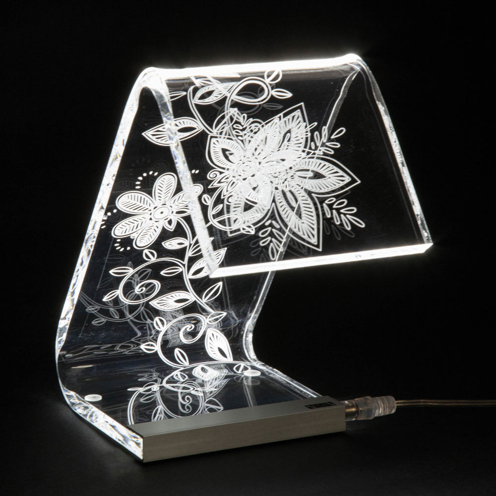 Esta lámpara de mesa   Está realizada íntegramente en cristal acrílico transparente y curvado a mano de 10 mm de espesor y se caracteriza por grabados láser en la superficie que, a través de una tira de LED colocada en la base, se iluminan a lo largo de toda la longitud del cuerpo luminoso, creando un extraordinario juego de efectos posible gracias a las características físico-técnicas del cristal acrílico.
