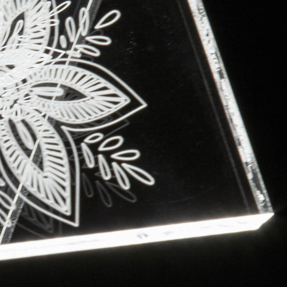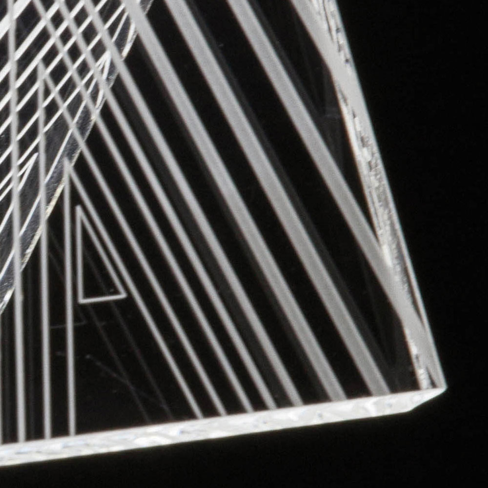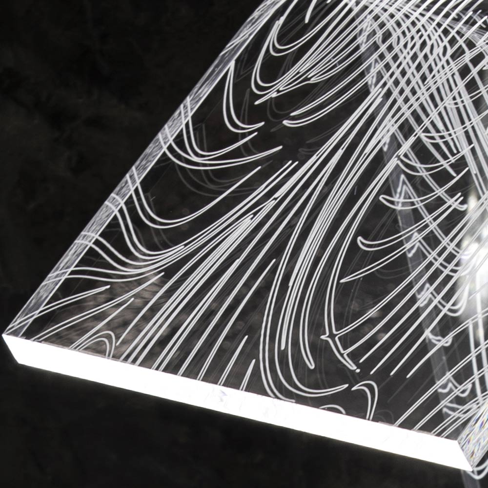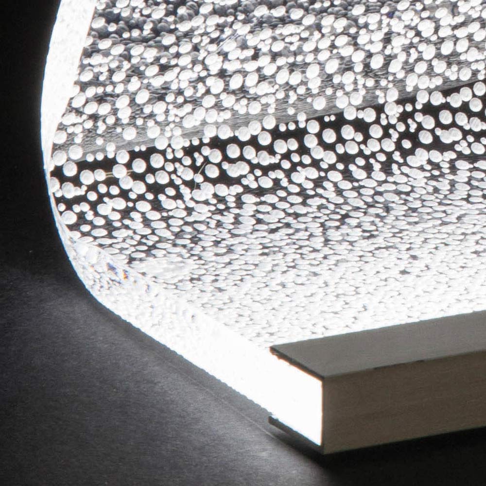 Esta lámpara de mesa   Está realizada íntegramente en cristal acrílico transparente y curvado a mano de 10 mm de espesor y se caracteriza por grabados láser en la superficie que, a través de una tira de LED colocada en la base, se iluminan a lo largo de toda la longitud del cuerpo luminoso, creando un extraordinario juego de efectos posible gracias a las características físico-técnicas del cristal acrílico.