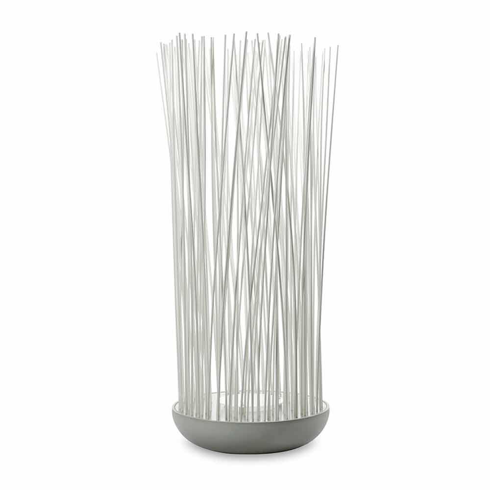 La lámpara está hecha de mate tecnopolímero gris y varillas blanco mate de PVC.