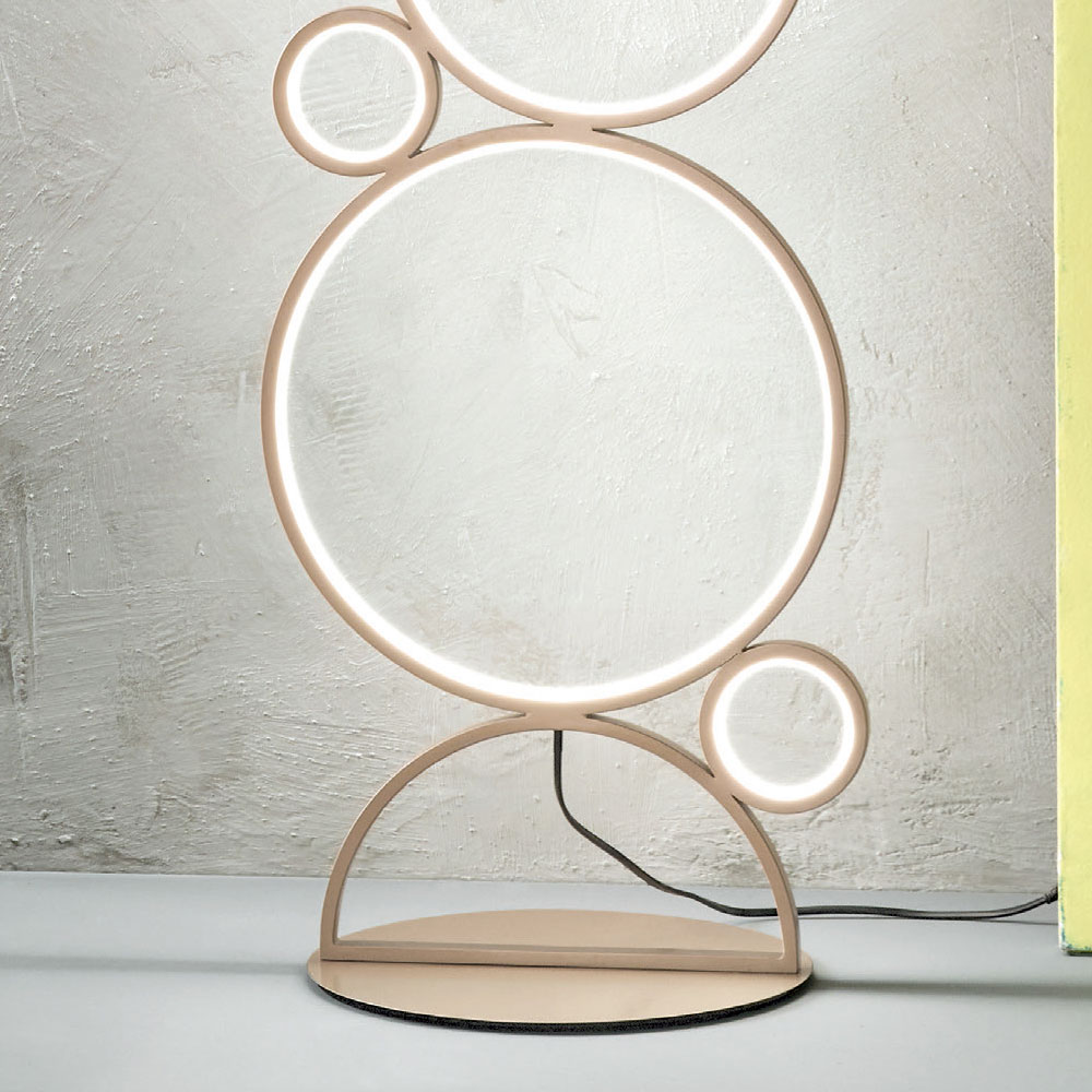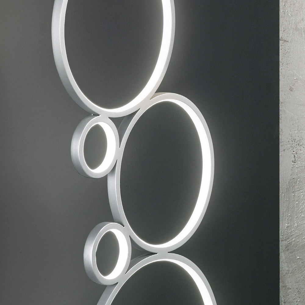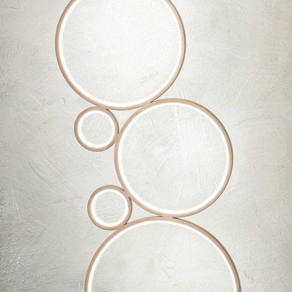 carácter versátil , que se puede instalar en cualquier ambiente doméstico: entrada, cocina, salón, dormitorio. Una original composición formada por círculos de diferentes tamaños unidos entre sí y recubiertos exteriormente por un difusor de color blanco lechoso que envuelve la tira LED creando maravillosos juegos de luz en las paredes para un resultado con un