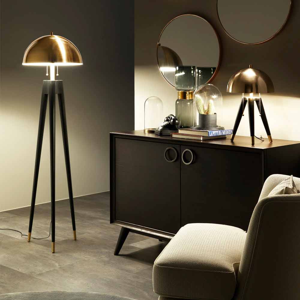 Esta lámpara de pie está compuesta por una estructura de metal negro con una tulipa abovedada de latón cepillado a juego con los detalles de la base de las 3 patas de apoyo, también en latón. El uso de estos refinados acabados de gusto en combinación con un diseño simple y lineal da vida a un complemento de decoración con una fuerte personalidad que no pasa desapercibida.