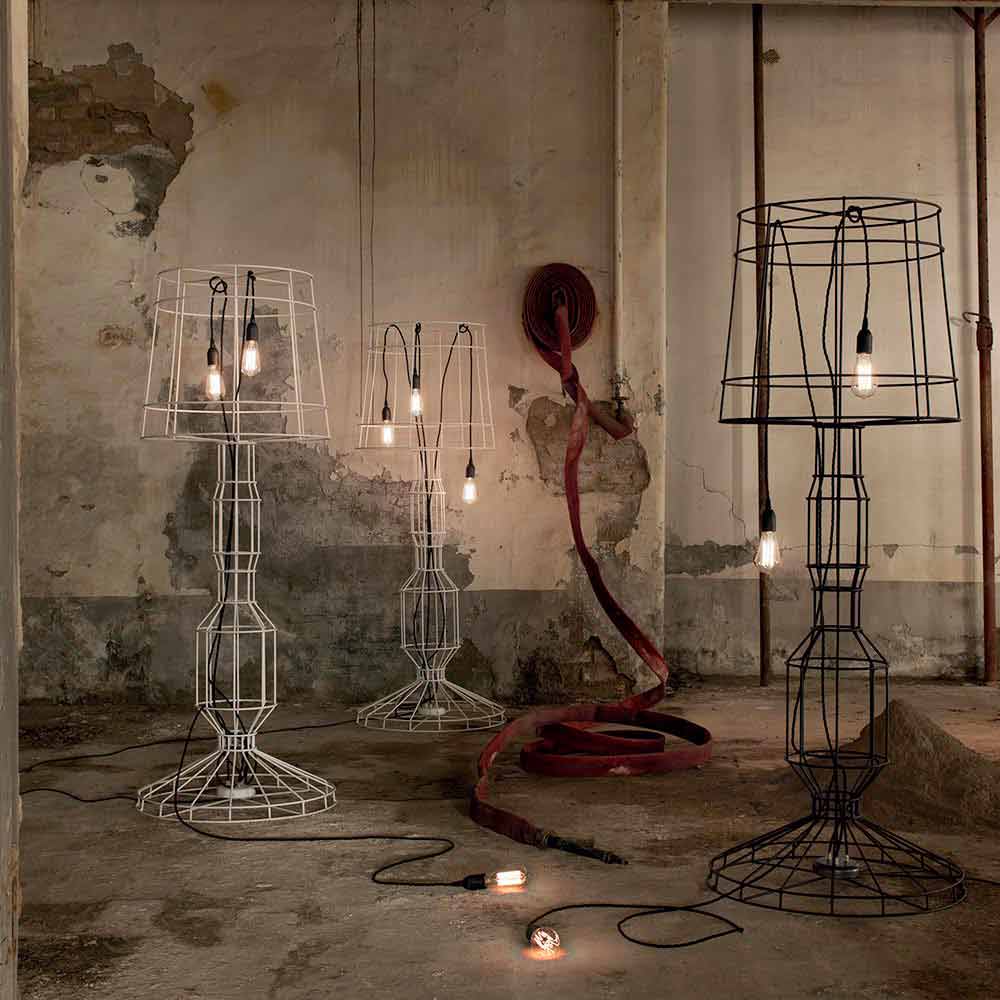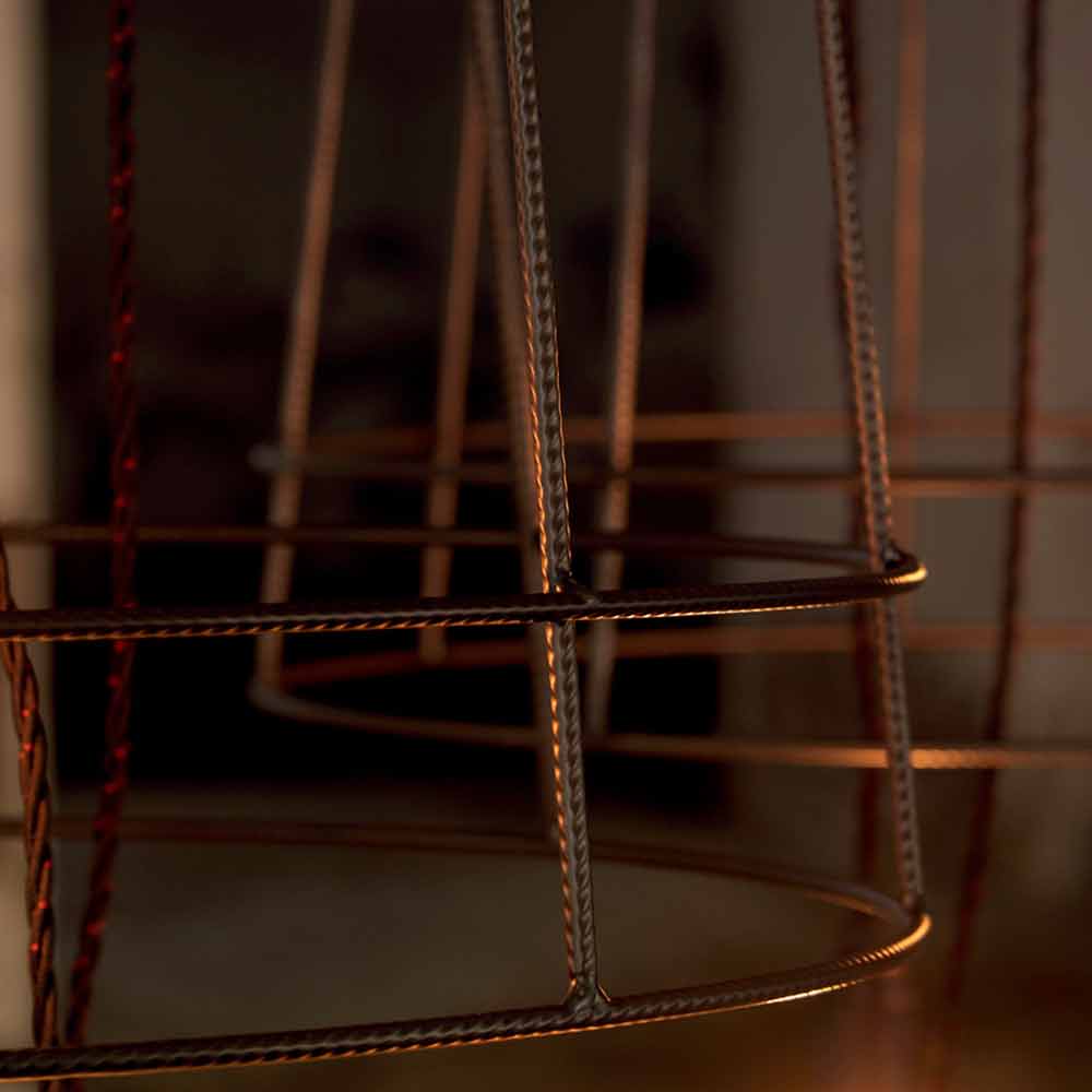 La lámpara está fabricada en varilla de metal nervado en dos acabados para un diseño íntegramente italiano que, a través de la experimentación poco convencional y la búsqueda continua entre tradición y modernidad , es capaz de asombrar, atrever y emocionar, permitiéndote expresar tus emociones a través de una decoración original y personal. uso de la luz.