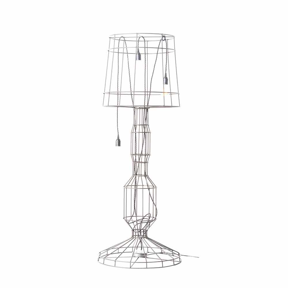 Esta lámpara de pie original y única presenta un diseño de metal con hierros de jardín moldeados y soldados. La peculiaridad consiste en su esqueleto esencial que da vida a un estilo industrial y minimalista listo para convertirse en una columna importante en el entorno del destino.