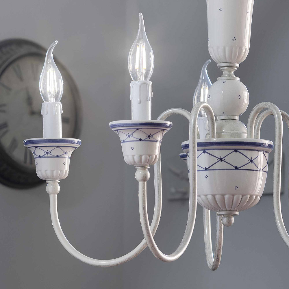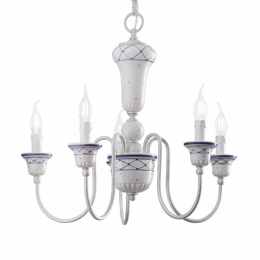 Araña de 5 luces de latón y cerámica pintada a mano fabricada artesanalmente en Italia por Ferroluce.