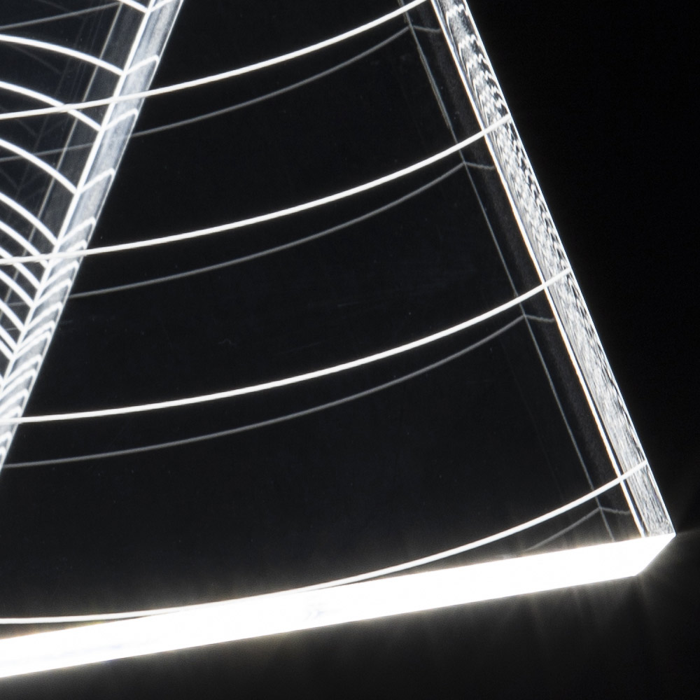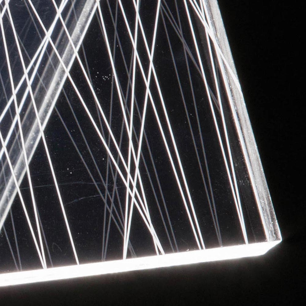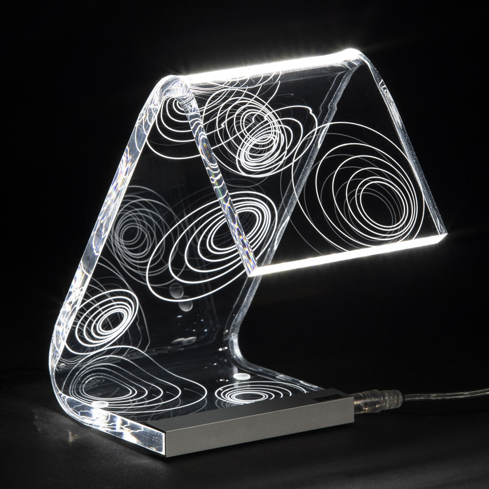 Esta lámpara de mesa Es enteramente hecho de cristal acrílico transparente y doblado a mano con un espesor de 10 mm y se caracteriza por grabados láser sobre la superficie que, a través de una tira llevada colocado en la base, hasta la luz a lo largo de toda la longitud del cuerpo de luz, creando un extraordinario efecto de juego hecho posible gracias a las características físico-técnicas del cristal acrílico.