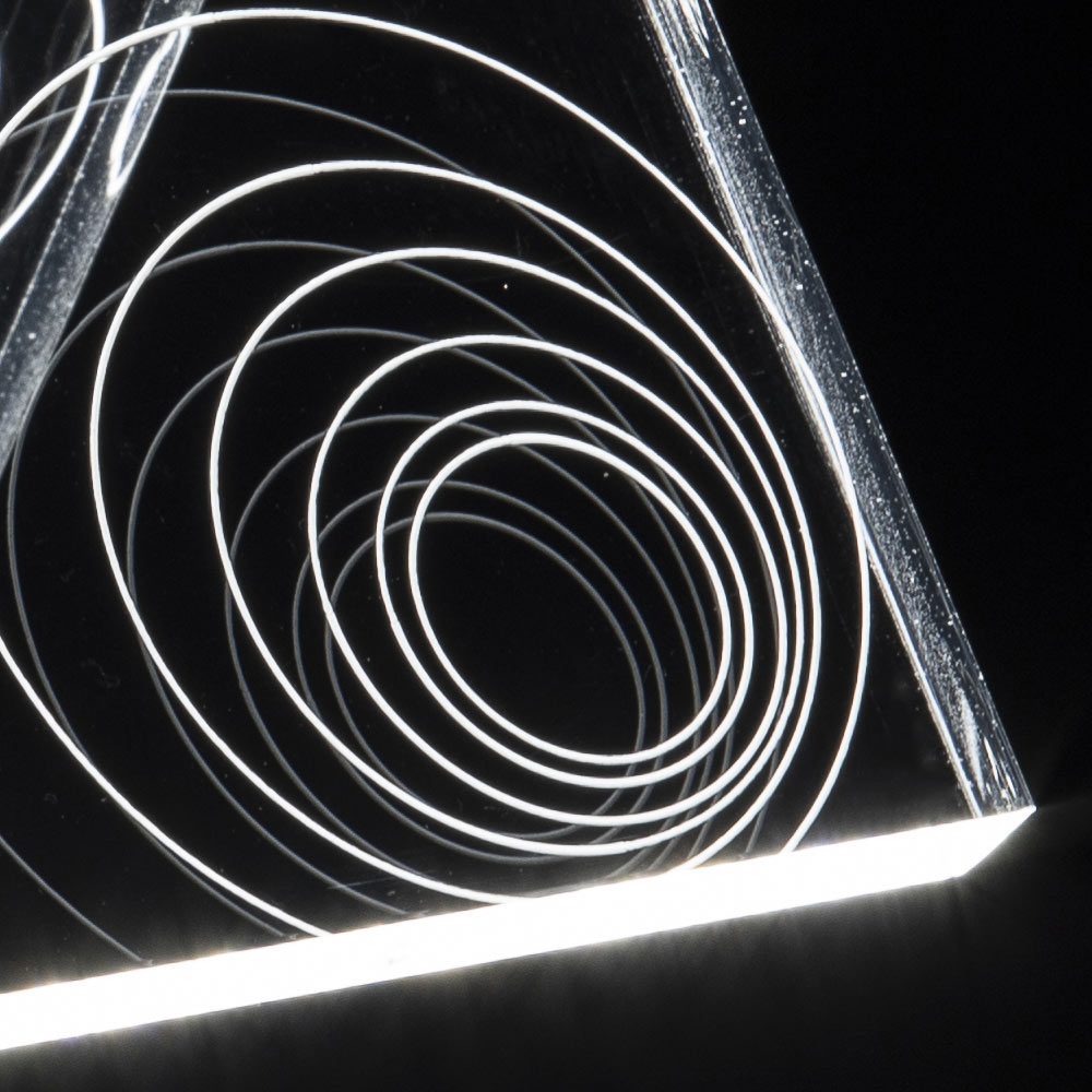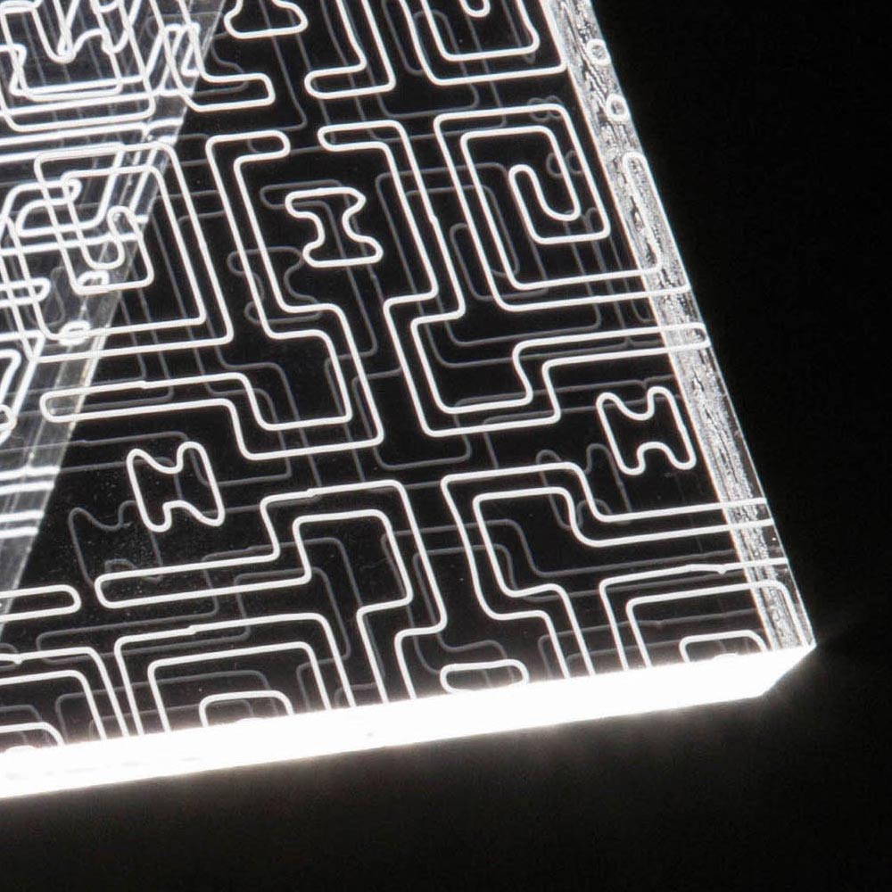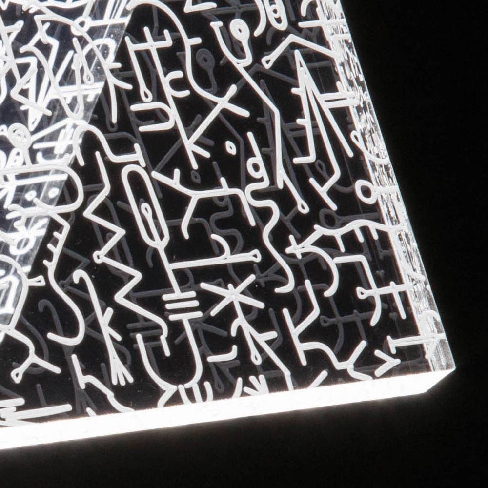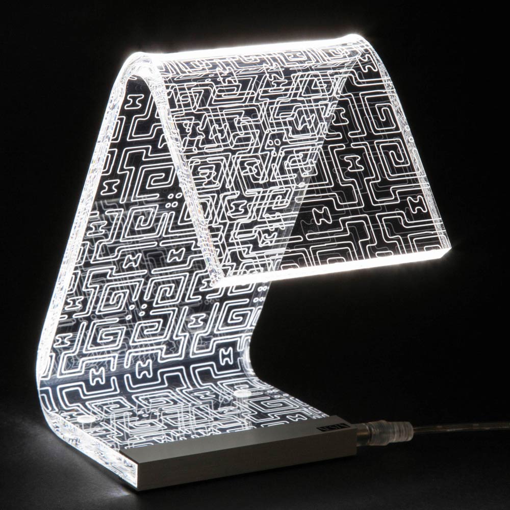 Esta lámpara de mesa Es enteramente hecho de cristal acrílico transparente y doblado a mano con un espesor de 10 mm y se caracteriza por grabados láser sobre la superficie que, a través de una tira llevada colocado en la base, hasta la luz a lo largo de toda la longitud del cuerpo de luz, creando un extraordinario efecto de juego hecho posible gracias a las características físico-técnicas del cristal acrílico.