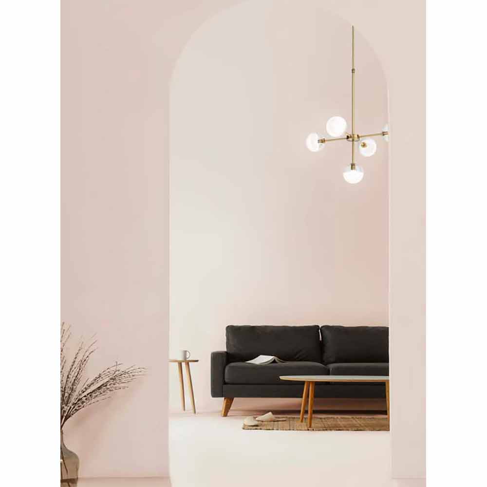 Lámpara de suspensión con 5 luces en latón natural y cristal de lujo transparente y arenado fabricado en Italia.