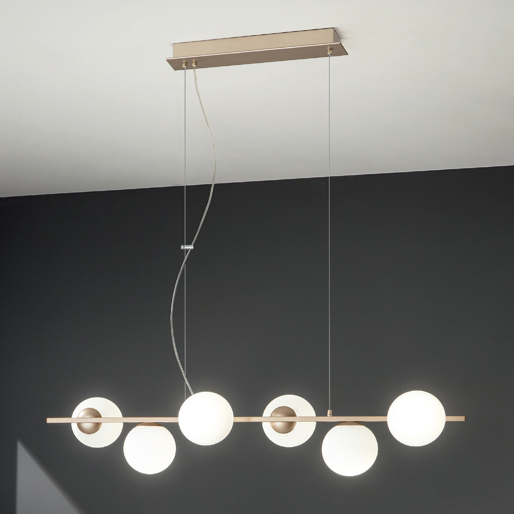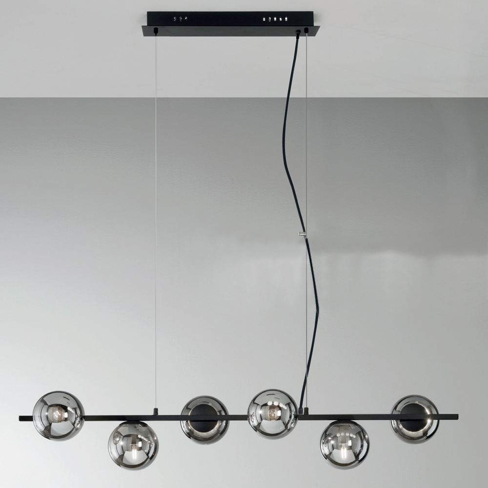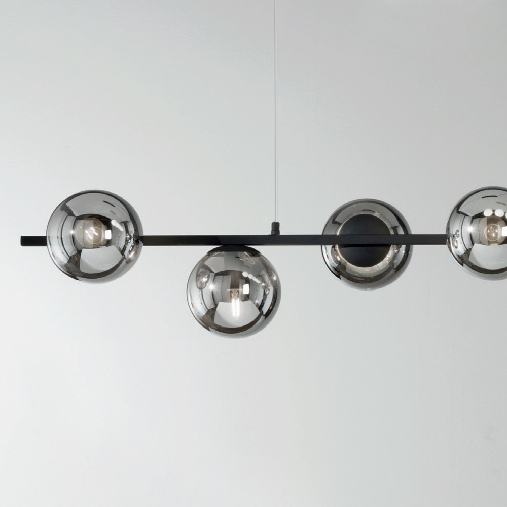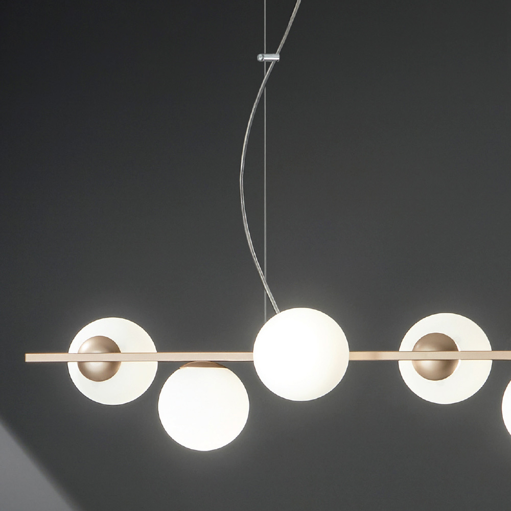 difusores esféricos de vidrio soplado con cables regulables en altura. De la combinación perfecta del toque moderno del metal y la elegancia atemporal del vidrio soplado,
